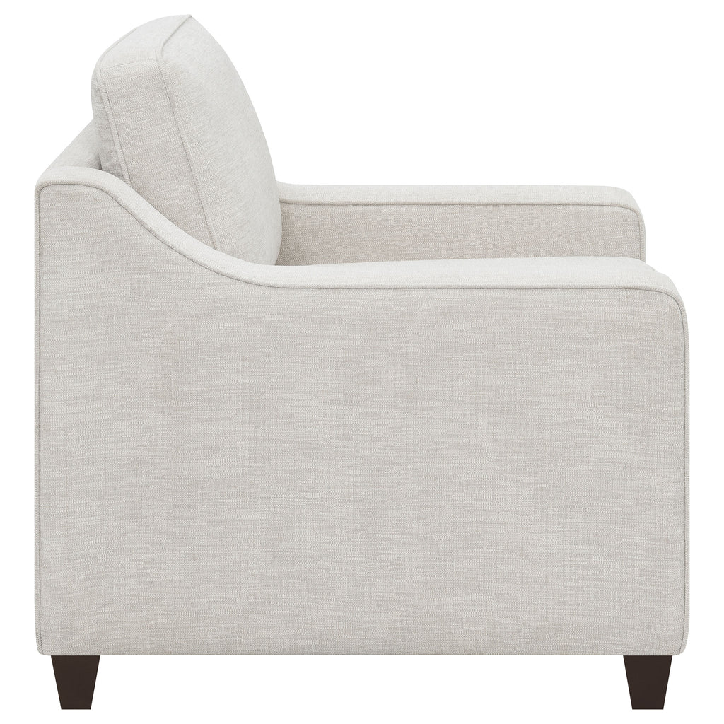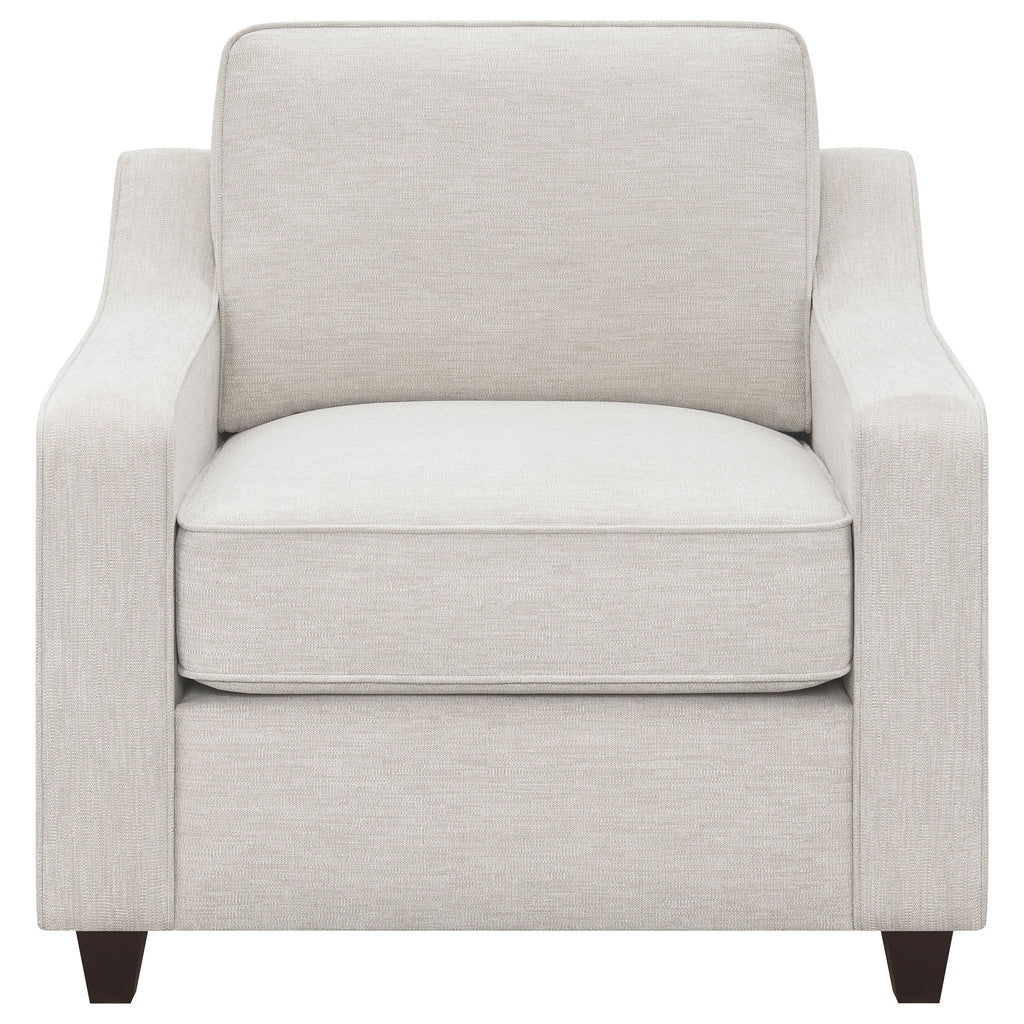 Add understated elegance to your seating area with this upholstered accent chair. Wrapped in soft beige chenille, it brings a light, airy feel that complements any décor. The sloped track arms and dark brown tapered wooden legs create a refined silhouette that balances comfort and sophistication. A boxed seat and back cushion with welt trim highlight its tailored design. Built with a sturdy wooden frame and plush foam cushioning, this chair offers timeless appeal and versatile style for modern or transitional interiors._x005F_x000D_ Key Features: • Accent chair with refined transitional design and soft silhouette • Beige chenille upholstery adds a light, versatile appearance • Sloped track arms create smooth modern lines and easy comfort • Boxed seat and back cushions feature classic welt detailing • Dark brown tapered legs add contrast and elegant support • Durable wooden frame ensures long-lasting everyday comfort