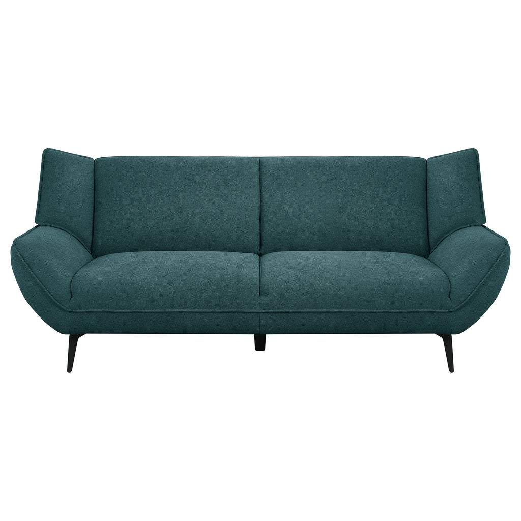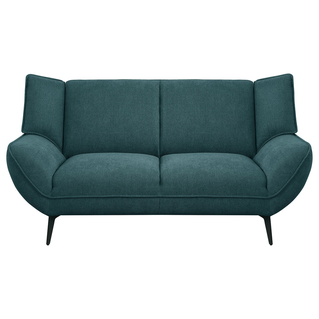 Bring the best of mid-century modern style to your casual space with this sofa set that inspires. This comfy and stylish teal blue set is a great choice for outfitting a living room or family room. Gorgeous fabric upholstery opens up possibilities for a lush palette choice. Flared arms and wing backs attach to non-removable seat and back cushions. Tapered black metal legs coordinate with the beautiful teal blue upholstery.