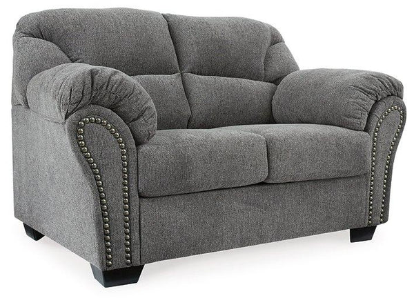 Why sacrifice comfort for style (or style for comfort) when you can have the best of both in this sofa and loveseat in pewter gray. Elements include a chic divided-back design and pillow top wrapped armrests that make nodding off all too easy. Calling attention to the elegantly flared armrests—black nickel-tone nailhead trim for a punch of cool character.