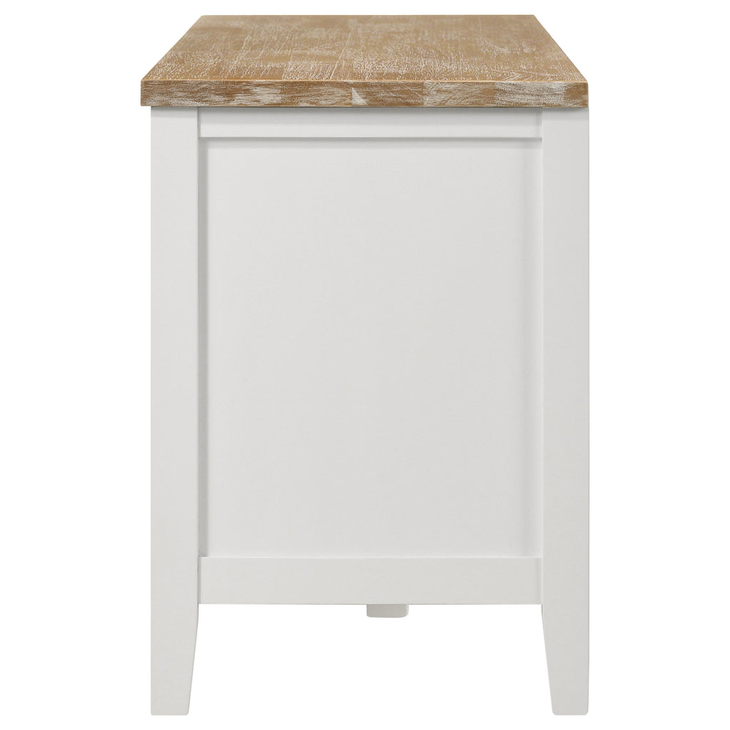 Versatility is a definite plus in the design of this charming transitional wood TV stand. Spacious and equipped with plenty of storage room, this console creates a breezy look with cottage, coastal, and farmhouse influence. A rectangular brown finish ash wood top provides a breathtaking contrast to a white finished frame. Place components in a center open space and on adjustable shelving behind two glass-front doors, and stash media and accessories in a large slide-out drawer. This all-in-one console organizes entertainment devices and accessories to make sure your media viewing is smooth and easily accessible. Key Features: • Transitional wood TV stand with cottage, coastal, and farmhouse influence • Rectangular brown finish ash wood top with white finished frame • Center open space and adjustable shelving behind two glass-front doors • Large slide-out drawer for media and accessories • All-in-one console to organize entertainment devices and accessories