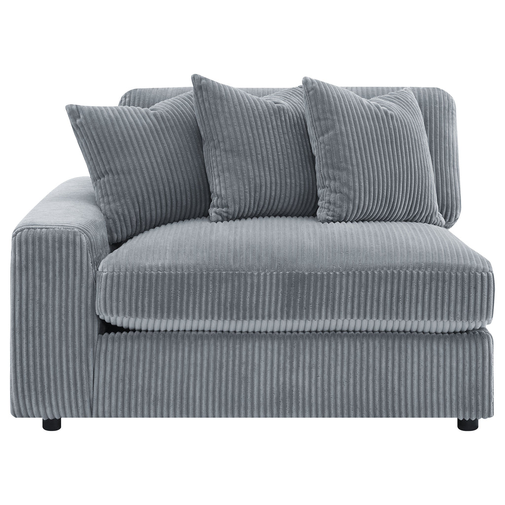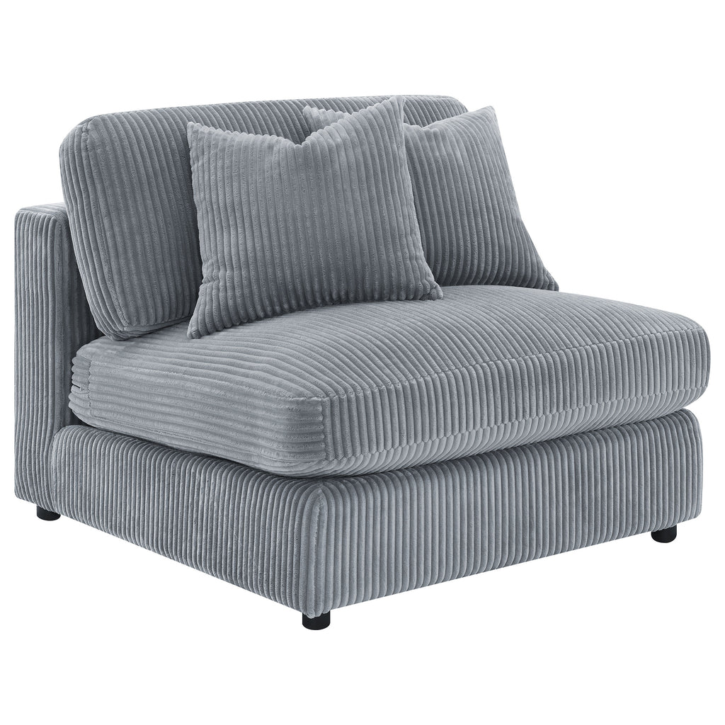 Wrap yourself in the inviting allure of this three-piece sectional, where timeless design meets modern versatility. The additional armless chair in the center expands your lounge space, creating a sanctuary of comfort and style. Draped in luxurious, wide corduroy fabric, this sectional whispers sophistication in either fog or sand hues. Its reversible chaise can adapt to any space, ensuring a perfect fit for your home's layout. Let this sofa be the canvas for your relaxation, crafted for those who appreciate both form and function. Key Features: • Three-piece reversible sectional; perfect furniture accessory for lounging • Soft, plush, endless comfort will keep you glued to your seat • Wide corduroy performance fabric • Reversible seat and back cushions • Premium down-like filled cushions and pillows for luxurious comfort • Black legs with non-slide grips ideal for smooth floor surfaces