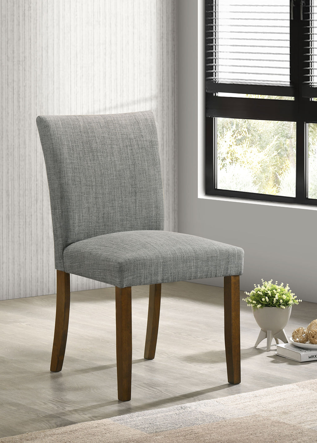 Upgrade your dining table with the fresh silhouettes and contemporary flair of this set of two modern side chairs. Each boasts an armless profile and lovely upholstery that creates the perfect touch of texture. Foam cushions provide exemplary comfort, perfect for everything from weeknight meals with the family to entertaining. Brown finish wood legs provide stability and create a hint of contrast against the upholstery. Choose this set for a new or existing dining table to bring a breath of fresh air.
