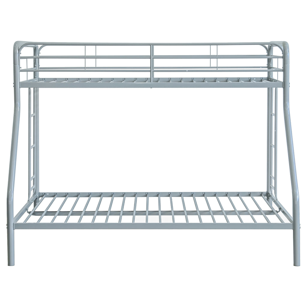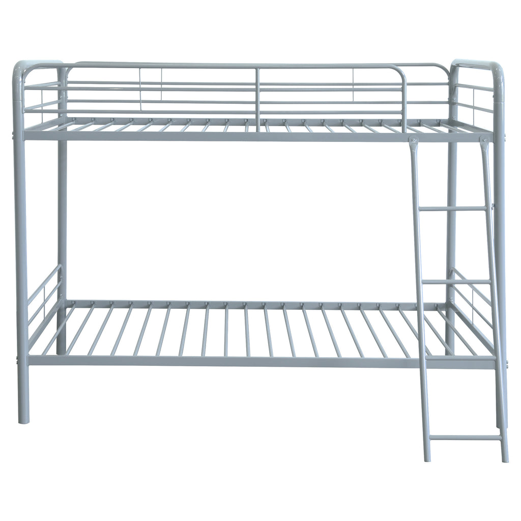 Maximize sleeping space with this modern metal bunk bed, designed for strength, safety, and everyday functionality. Its powder-coated glossy finish enhances the sleek silhouette, while full-length guardrails on the top bunk ensure secure rest. A built-in ladder provides stable access, integrated directly into the frame for a clean look and compact footprint. With metal slat support for both sleeping surfaces, this bunk bed eliminates the need for foundations and suits shared rooms with style and durability. Key Features: • Twin-over-twin bunk bed in glossy black powder-coated finish with clean, modern lines • Top bunk includes full-length guardrails for added safety and secure sleeping space • Angled built-in ladder allows easy access to upper bunk with a compact footprint • Metal slat system eliminates the need for a box spring or additional foundation • Space-saving vertical design ideal for shared kids’ rooms, dorms, or sleepover setups • Crafted from durable metal for everyday strength and long-lasting performance