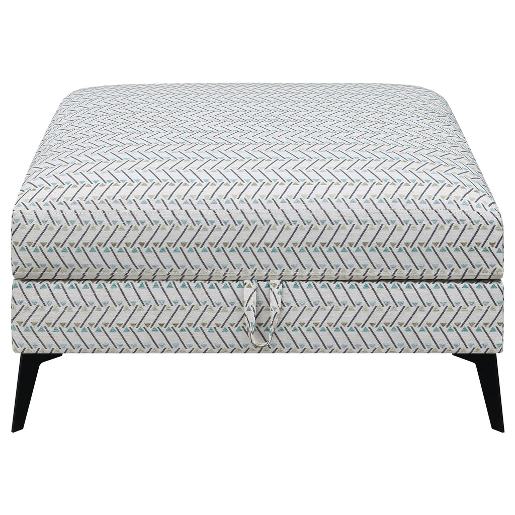 Function and fashion mix with a delightful result in this modern storage ottoman. Brighten a sofa set or sectional with a square ottoman adding plenty of surface and storage space. Covered in fabric with a compelling geometric design, its gray-centered palette blends with a mix of pieces in a living room or bedroom. A fully enchased engineered wood frame with stylish black metal legs and a black lined interior adds a tasteful angle, while a looped handle easily lifts its upholstered top. Use this storage ottoman as a footrest or for extra seating.
