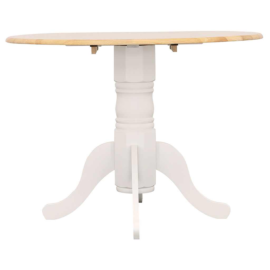 Bring cozy charm to your dining area with this round drop leaf dining table. Designed with a smooth tabletop and sturdy pedestal base, it combines traditional craftsmanship with functional versatility. The drop-leaf design allows you to expand or reduce the surface space as needed, perfect for compact dining areas or breakfast nooks. Elegant curved legs add a touch of sophistication, while the contrasting natural wood top and white base create a bright, welcoming two-tone look for everyday gatherings. Key Features: • Dining table features a classic round drop-leaf top for versatile seating • Crafted from solid rubberwood for dependable everyday durability • Smooth two-tone finish with a natural top and crisp white base • Elegant turned pedestal design adds timeless farmhouse appeal • Four curved legs provide balanced support and visual refinement • Perfect size for small dining spaces, kitchens, or breakfast nooks
