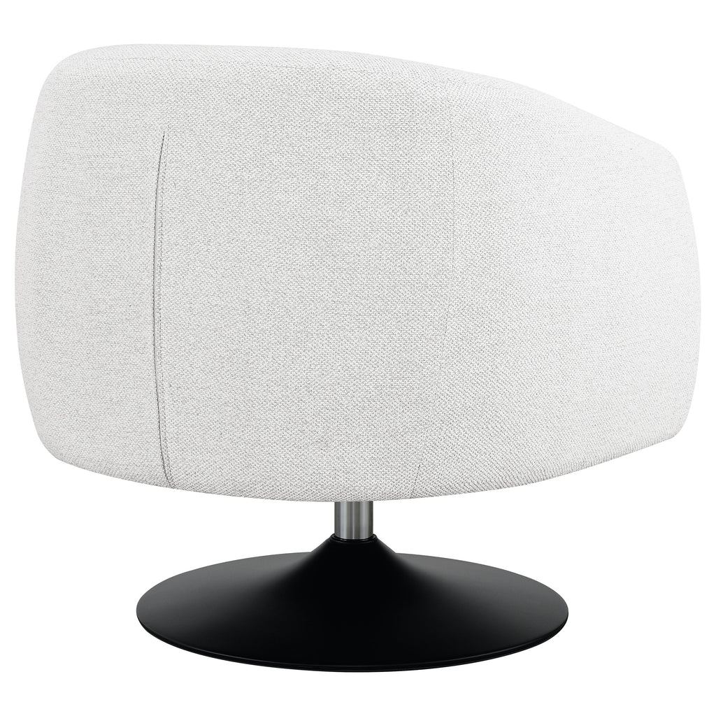 Elevate your seating area with this stylish swivel accent chair that blends modern sophistication with retro charm. Wrapped in soft beige boucle fabric, it offers a tactile texture and inviting comfort. The barrel-back silhouette features a tailored seat and gently curved arms for a clean, contemporary look. Supported by a matte black pedestal base, the chair rotates a full 360 degrees for effortless movement. Perfect for a living room or reading nook, it combines comfort, versatility, and modern flair. Key Features: • Swivel accent chair with stylish barrel-back silhouette and retro appeal • Soft beige boucle upholstery offers tactile texture and inviting comfort • Matte black pedestal base adds a sleek, modern contrast beneath seat • Full 360-degree swivel motion ensures smooth effortless mobility • Tailored tight back and seat provide clean lines and structured support • Durable metal, plywood, and larch frame ensures lasting stability