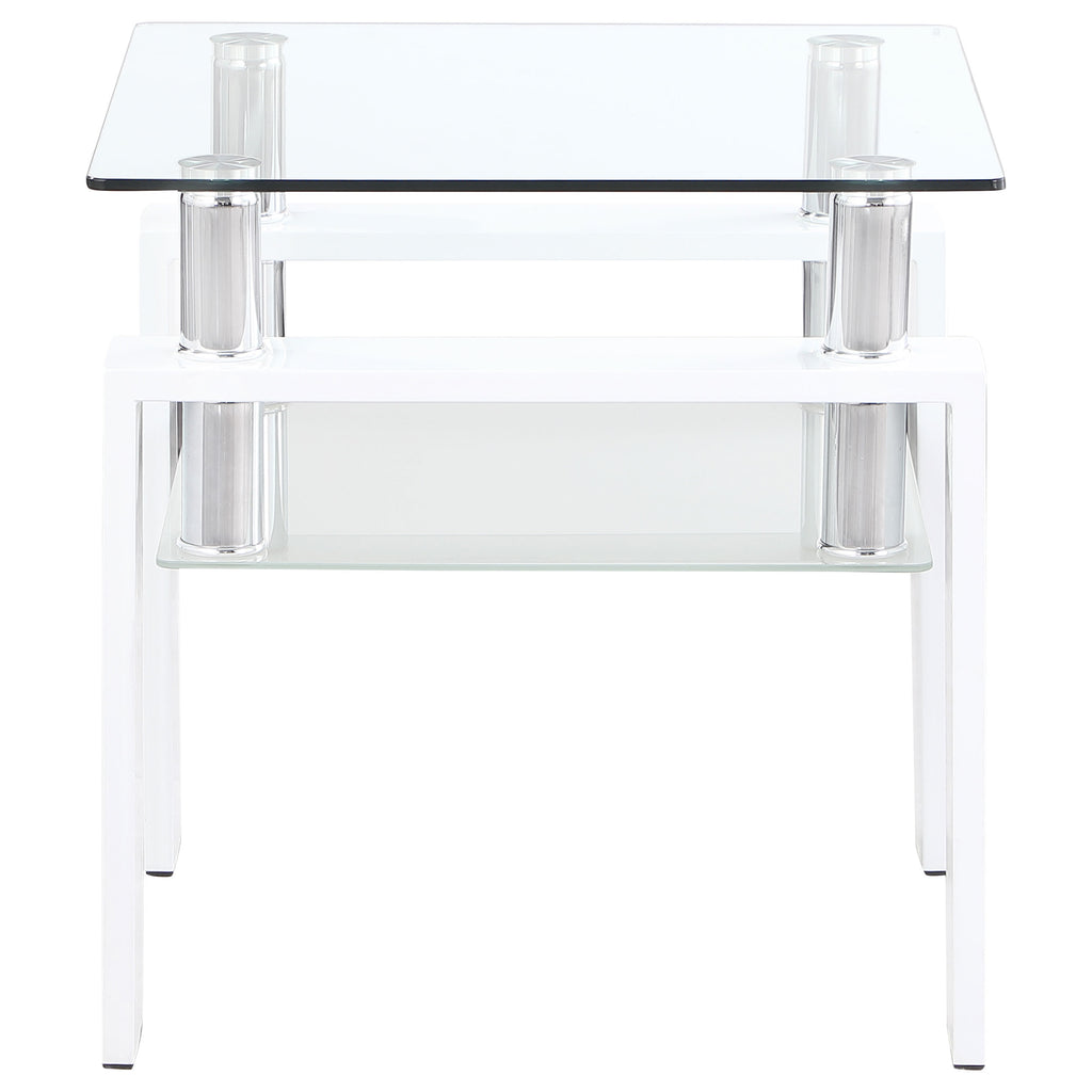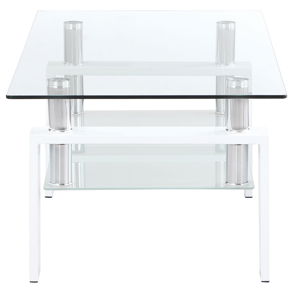 This modern coffee table set combines a rectangular coffee table and square end table, each featuring a clear tempered glass top and a frosted tempered glass shelf for extra storage or display. Supported by durable metal frames, the tables are finished in a durable powder coating, adding a bold or sleek look to your living space. This set provides versatile functionality with its open and airy design, perfect for contemporary interiors. Key Features: • Coffee table set includes a rectangular cocktail table and square end table • Clear tempered glass tops with frosted tempered glass shelves for storage • Durable metal frames with a white powder coated finish for a polished look • Sleek, modern design complements contemporary living room styles • Clear and frosted glass elements enhance the bright, open aesthetic • Versatile set perfect for both daily use and entertaining guests