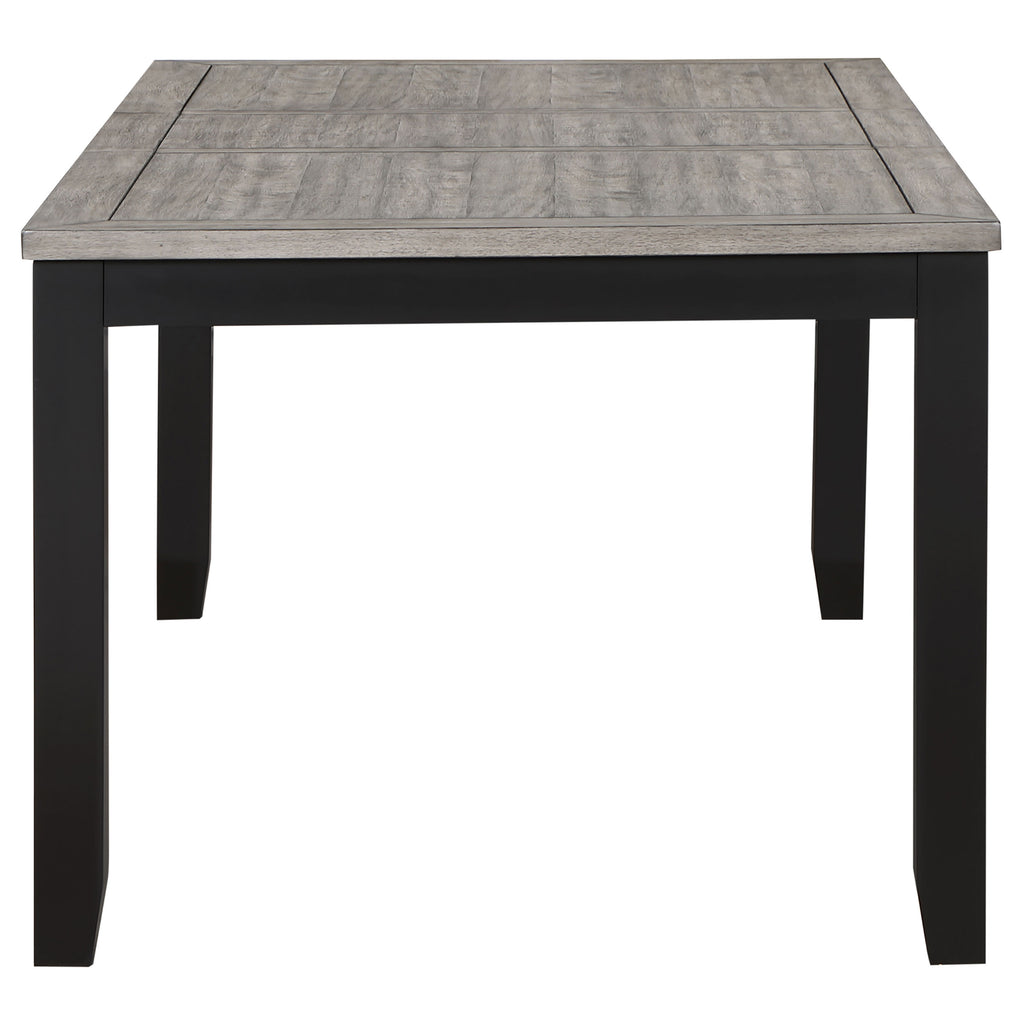 Elevate your dining experience with this farmhouse-inspired two-tone finished dining set. The table extends from 60" to 78" with an 18" extension leaf and features a wood on metal glide for smooth transitions. The side chairs, available in both regular and kitchen counter height, boast a grey and black two-tone design, with a plywood base and 100% polyester dove grey fabric for maximum comfort. Key Features: • Elevate your dining experience with this farmhouse-inspired two-tone finished dining set • Table extends from 60" to 78" with an 18" extension leaf and features a wood on metal glide for smooth transitions • Side chairs boasting a grey and black two-tone design • Plywood base and 100% polyester dove grey fabric for maximum comfort • Perfect for any home, adding a touch of modern style and sophistication