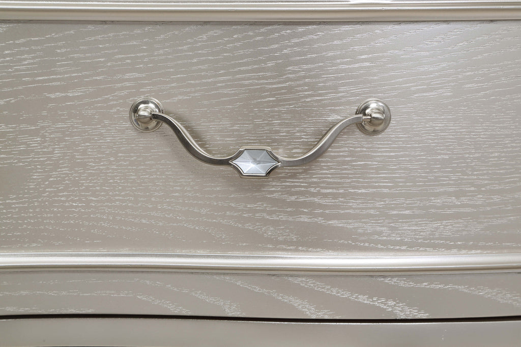 Elevate your guest room or main bedroom with this breathtaking glam chest. The space-saving tall design boasts a curvy front facade, seen throughout the wavy wood trim appointed drawer panels. Five spacious drawers offer ample space for all your bedroom necessities, along with a soft grey felt-lined top drawer for more delicate items. A silver oak finish covers the entire chest frame as slender glittering side panels lend a luxe modern flair. Hexagon-shaped knobs and hexagon-accented drop bail pulls offer a finishing touch.