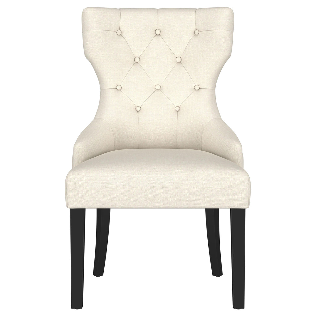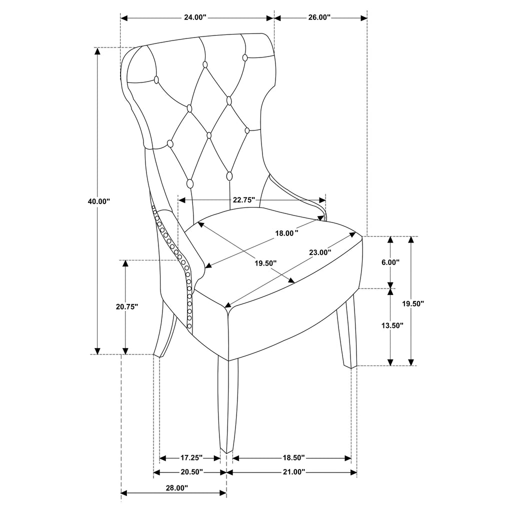 Transform your dining space with the perfect blend of timeless elegance and modern comfort. This dining set showcases a stately rectangular table with a double pedestal trestle base, evoking romantic charm and artisanal craftsmanship. The antique black finish lends a dramatic, yet versatile touch to any dining room. Paired with beautifully tufted dining chairs, the set brings a soft, inviting aesthetic, with plush cushioning and a graceful wingback silhouette. Designed for hosting family dinners or special gatherings, the table expands easily with a removable leaf, ensuring ample space for cherished guests. This dining set combines refined detail and functional versatility, creating a warm and welcoming space for every meal. Key Features: • Rectangular dining table with a bold double pedestal trestle base adds a touch of timeless charm • Antique black finish adds rich drama and refinement to your dining room décor • Decorative plank-style tabletop includes a removable 16-inch extension leaf for added versatility • Beige fabric upholstered tufted dining chairs with a classic wingback silhouette provide both comfort and style • Nailhead trim and soft upholstery with button tufting on the chairs bring an elegant finishing touch