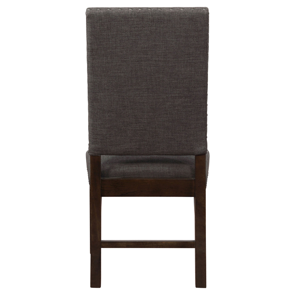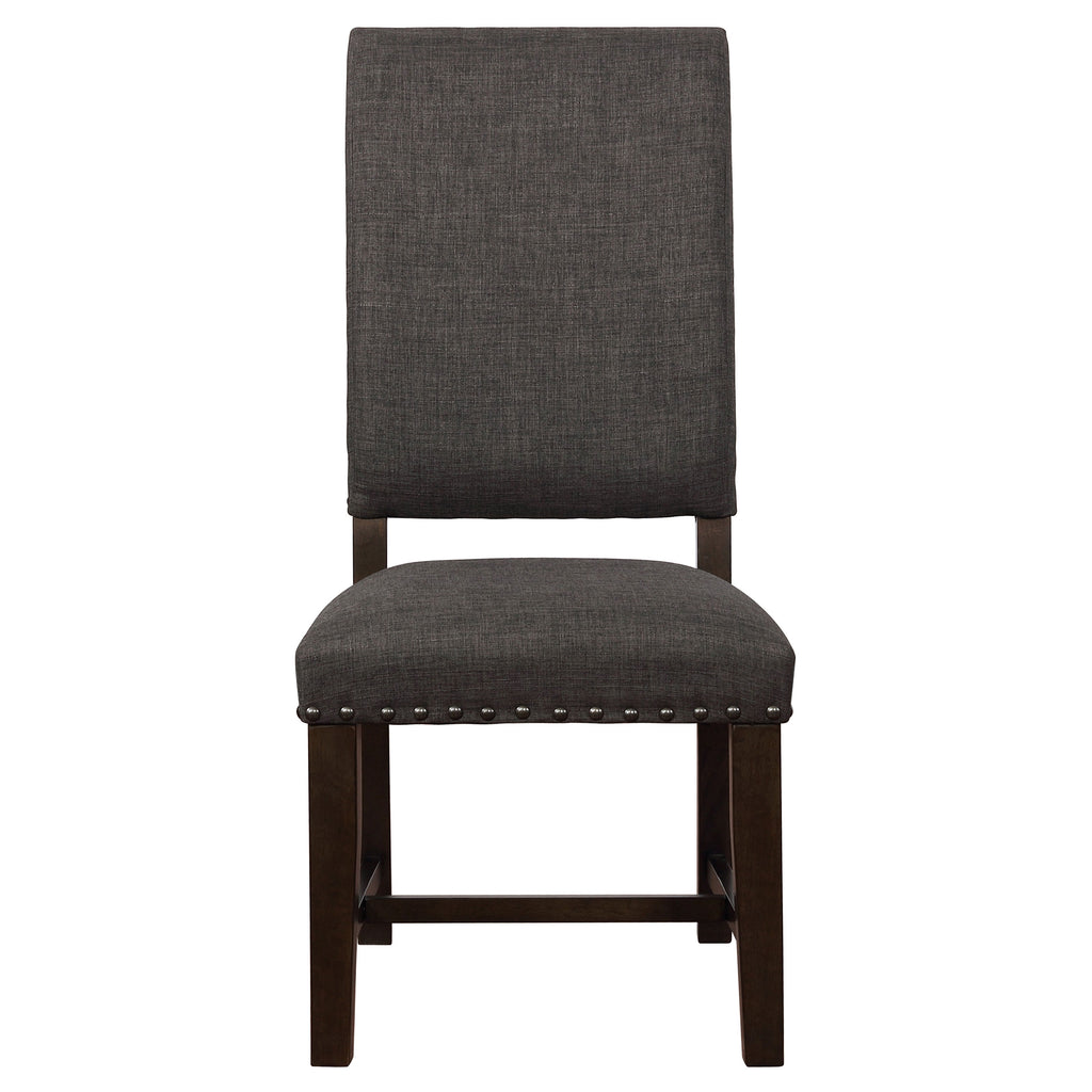 Simple, yet elegant Parsons chair is a welcome addition to your home. Regardless of décor, this side chair fits in seamlessly. Upholstered in sumptuous warm grey fabric. Characteristically armless for an easy getaway to the kitchen to check on your signature apple pie. Seat back is moderately flared, a welcome feature for leaning back when you've overindulged. Key Features: • Upholstered dining side chairs feature classic Parsons styling and armless design • Warm grey polyester fabric offers soft texture and neutral versatility • Moderately flared seat backs provide gentle support for relaxed dining • Bronze nailhead trim outlines seat and back for tailored visual detail • Crafted with solid rubberwood and foam cushioning for comfort and strength • Smokey black wood finish grounds the frame with a bold, refined contrast