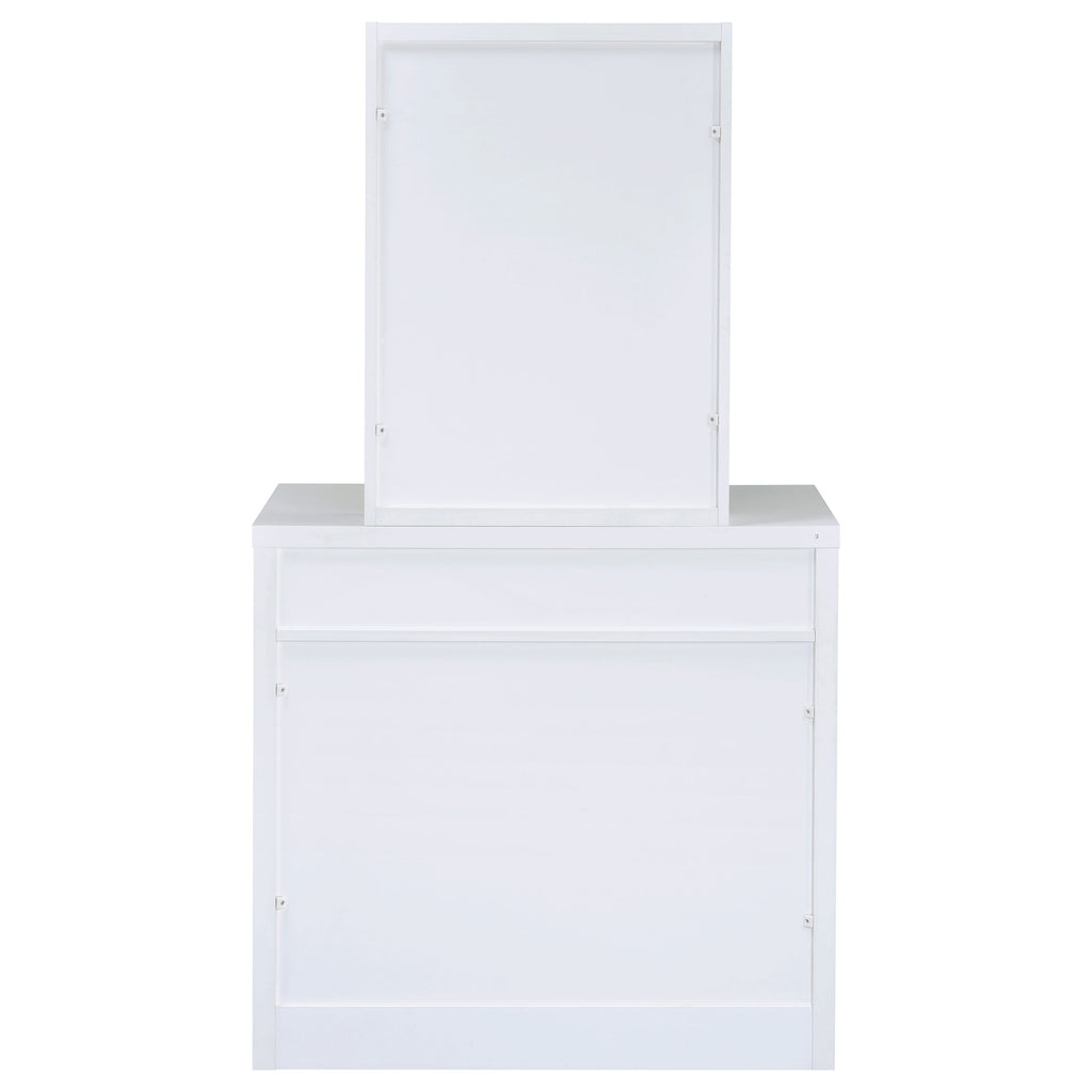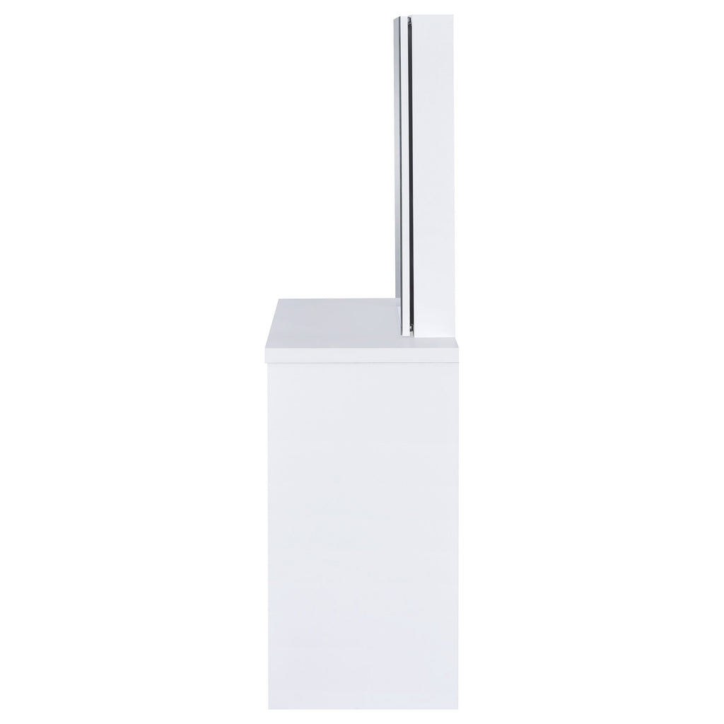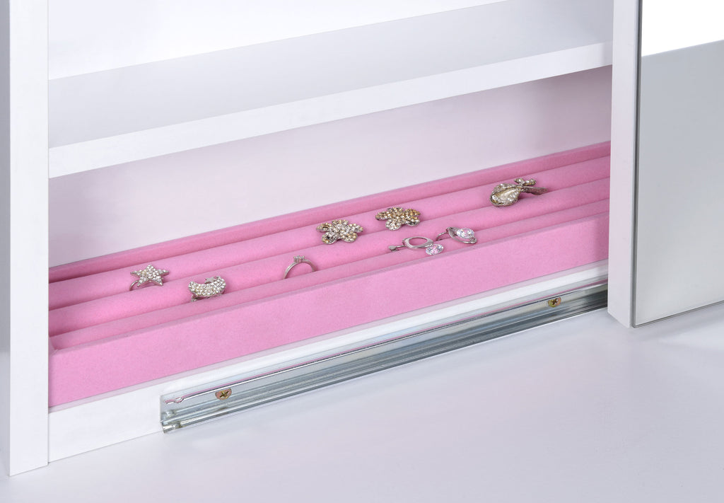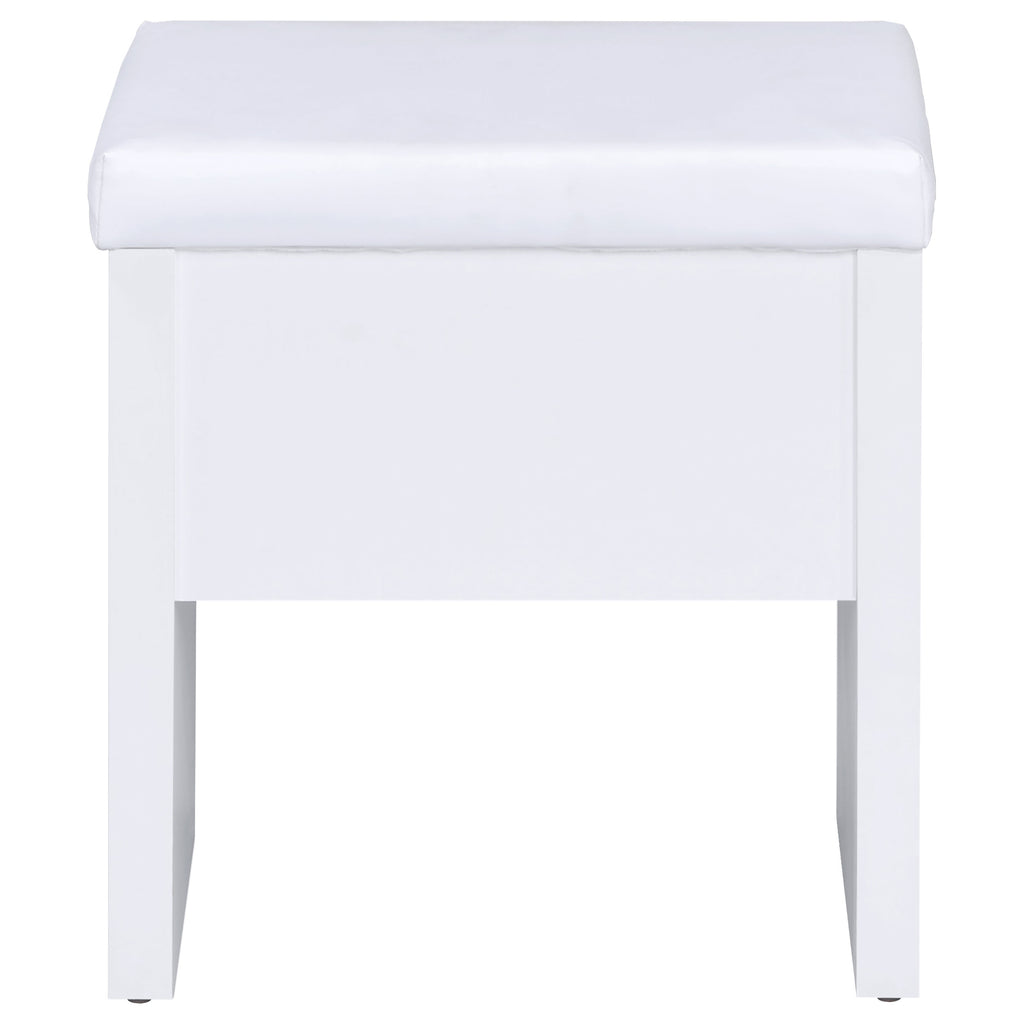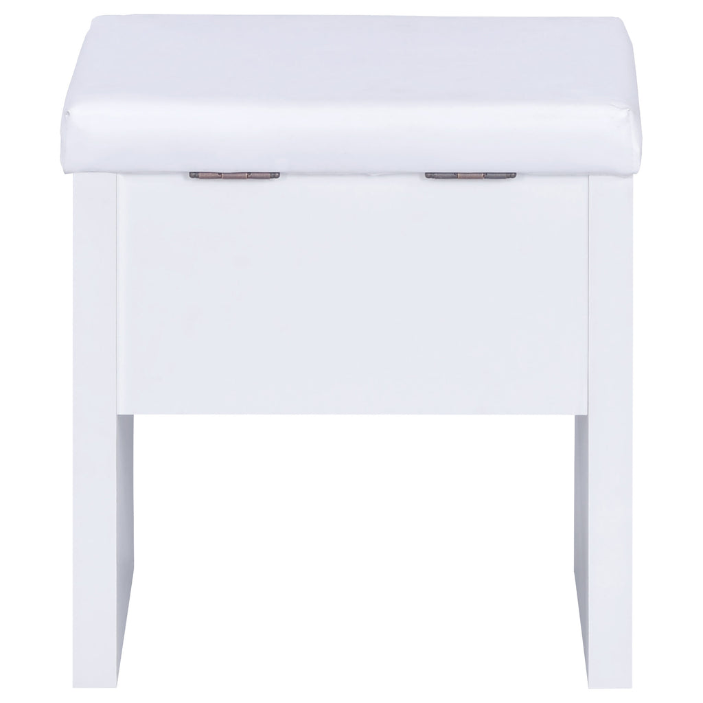 Contemporary white vanity looks great in a modern-style bedroom or dressing room and comes designed to hold your secrets better than a BFF. Pull-out drawer is spacious and compartmentalized for organization to get ready in a hurry (on those rare occasions). The large mirror slides open to reveal concealed jewelry storage compartments. Upholstered stool opens to reveal yet another storage area. This vanity truly is a woman's best friend. Key Features: • Modern three-piece vanity set with clean lines • Features storage mirror and one drawer • Slide-to-open mirror features jewelry hooks, two shelves, and ring storage • Flip-top storage stool with padded cushion upholstered in leatherette • Available in your choice of cappuccino with black leatherette or white with white leatherette