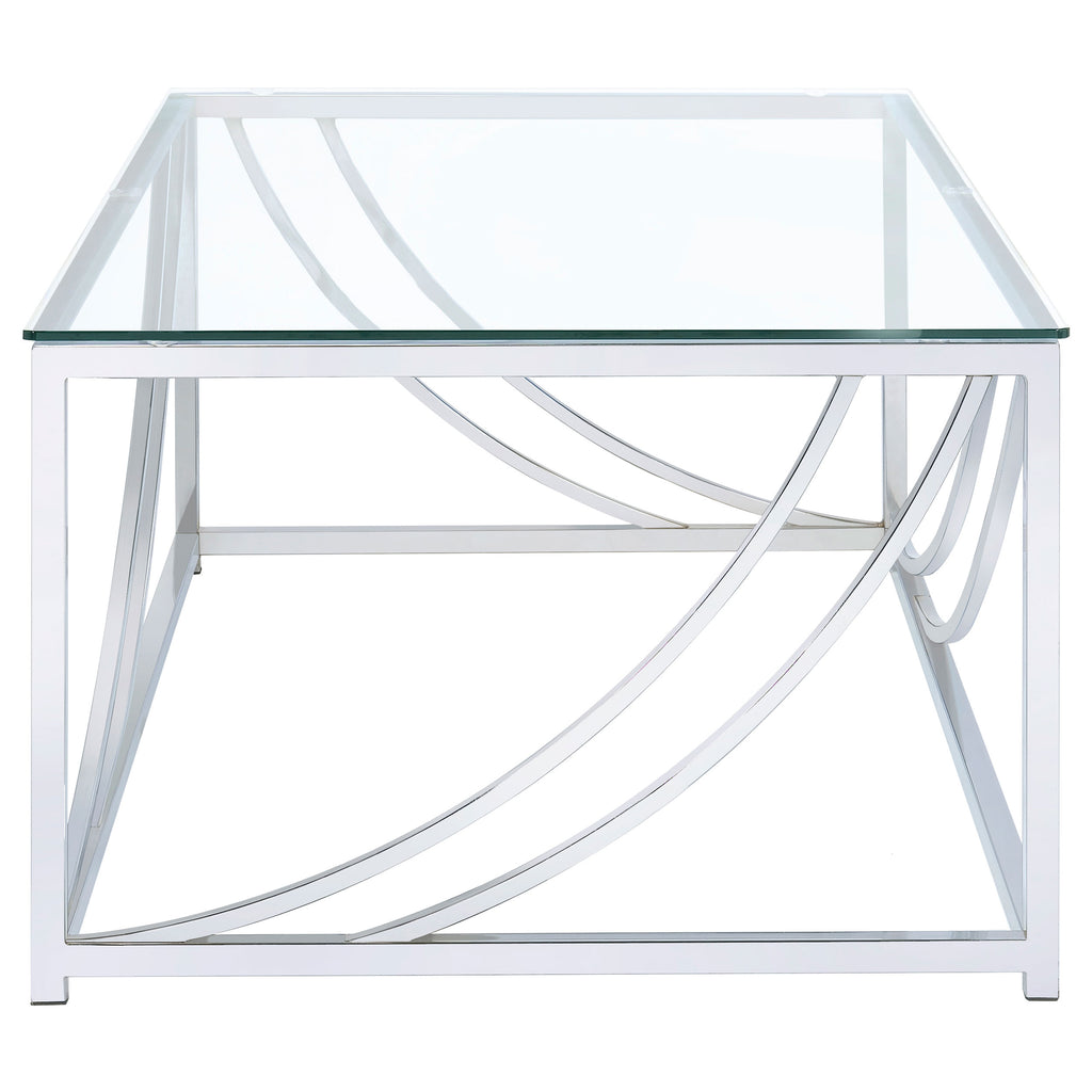 This rectangular coffee table boasts a modern design with a clear tempered glass top that highlights its sleek aesthetic. The sturdy metal frame, finished in electroplated polished chrome, features gracefully curved accents for an elegant touch. Its minimalist structure pairs style with durability, ensuring long-lasting use. Perfect for living rooms, this table combines functionality with a refined contemporary appeal. Key Features: • Rectangular coffee table featuring a clear tempered glass top for durability • Electroplated polished chrome frame with a sleek, reflective finish • Gracefully curved metal accents offer a modern, elegant design touch • Sturdy metal construction ensures long-lasting strength and stability • Spacious clear glass top provides ample surface area for daily use • Minimalist structure perfectly blends with contemporary interiors