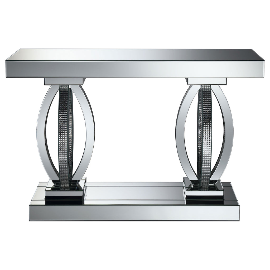 This mirrored console table features an elegant design with a rectangular top and bold, oval-shaped bases. The base is adorned with acrylic crystals, adding a luxurious and glamorous touch to its modern aesthetic. Crafted with mirrored surfaces, this table reflects light beautifully, creating an ambiance of sophistication. Ideal for entryways, living rooms, or hallways, this console table combines style and functionality with a focus on durability. Key Features: • Mirrored console table with sleek rectangular top and bold oval-shaped bases • Acrylic crystal accents on the base add a glamorous and luxurious touch • Mirrored surfaces reflect light for a bright and sophisticated atmosphere • Solid construction ensures stability and long-lasting durability • Rectangular tabletop provides ample space for decorative objects or essentials • Perfect for use in entryways, living rooms, or hallways as a statement piece