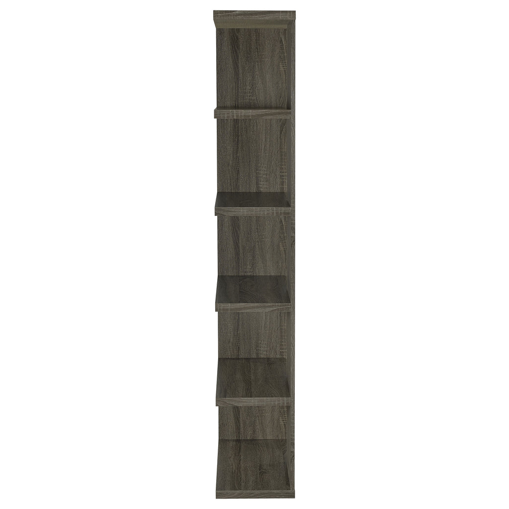 Add a touch of modern charm to any room with this stylish bookshelf in a weathered grey finish. Designed with a mix of open and backed shelving, it brings visual intrigue and versatility to your storage needs. Crafted from engineered wood and finished in eco-friendly melamine veneer, this unit offers five spacious tiers perfect for books, décor, and keepsakes in a contemporary home office or living space. Key Features: • Modern bookshelf with five staggered shelves for stylish organization • Weathered grey finish adds a rustic yet contemporary visual appeal • Open-end shelf design provides dimension and lightness to the silhouette • Ideal for displaying books, framed photos, or small potted plants • Made of engineered wood with a durable melamine veneer for longevity • Compact footprint suits apartments, home offices, or cozy reading corners