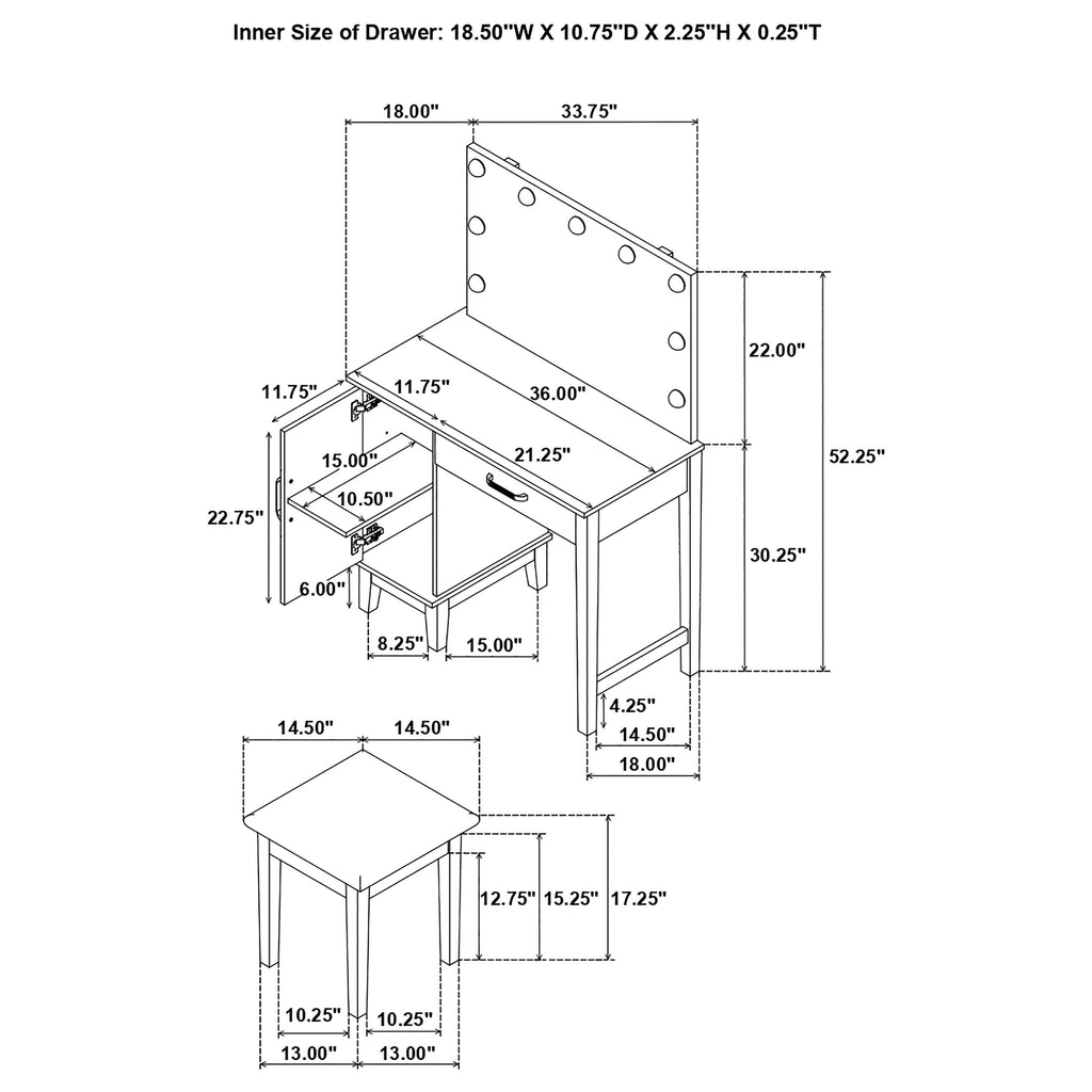 This contemporary vanity set blends practicality with modern elegance. The bright white finish and sleek silhouette highlight a Hollywood-inspired mirror surrounded by nine LED bulbs, providing the perfect light for daily routines. A single drawer and side cabinet offer organized storage for cosmetics and accessories, while the cushioned dark grey stool ensures comfort during use. Crafted from engineered wood with solid wood legs, this vanity set delivers both function and timeless sophistication to any bedroom. Key Features: • Modern vanity set in bright white finish with LED lighting for Hollywood-style flair • Nine built-in LED bulbs provide perfect illumination for daily beauty routines • Includes a single drawer and side cabinet for organized accessory storage • Cushioned dark grey stool adds comfort and contrast to the vanity’s design • Crafted from engineered wood with solid wood legs for lasting stability • Ideal for bedrooms or dressing areas with a clean, contemporary aesthetic