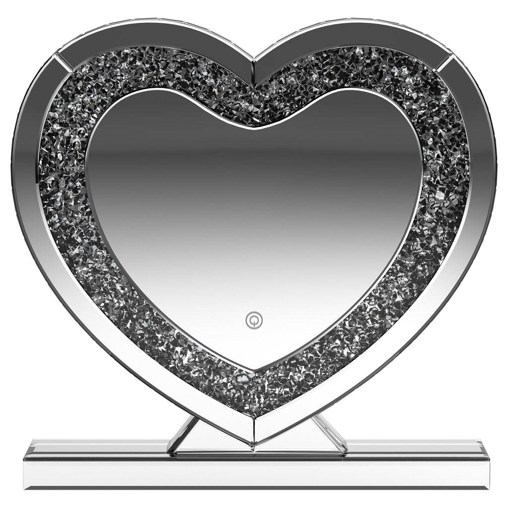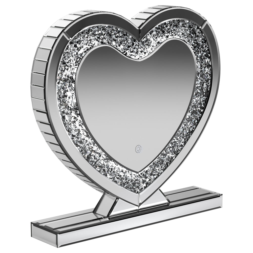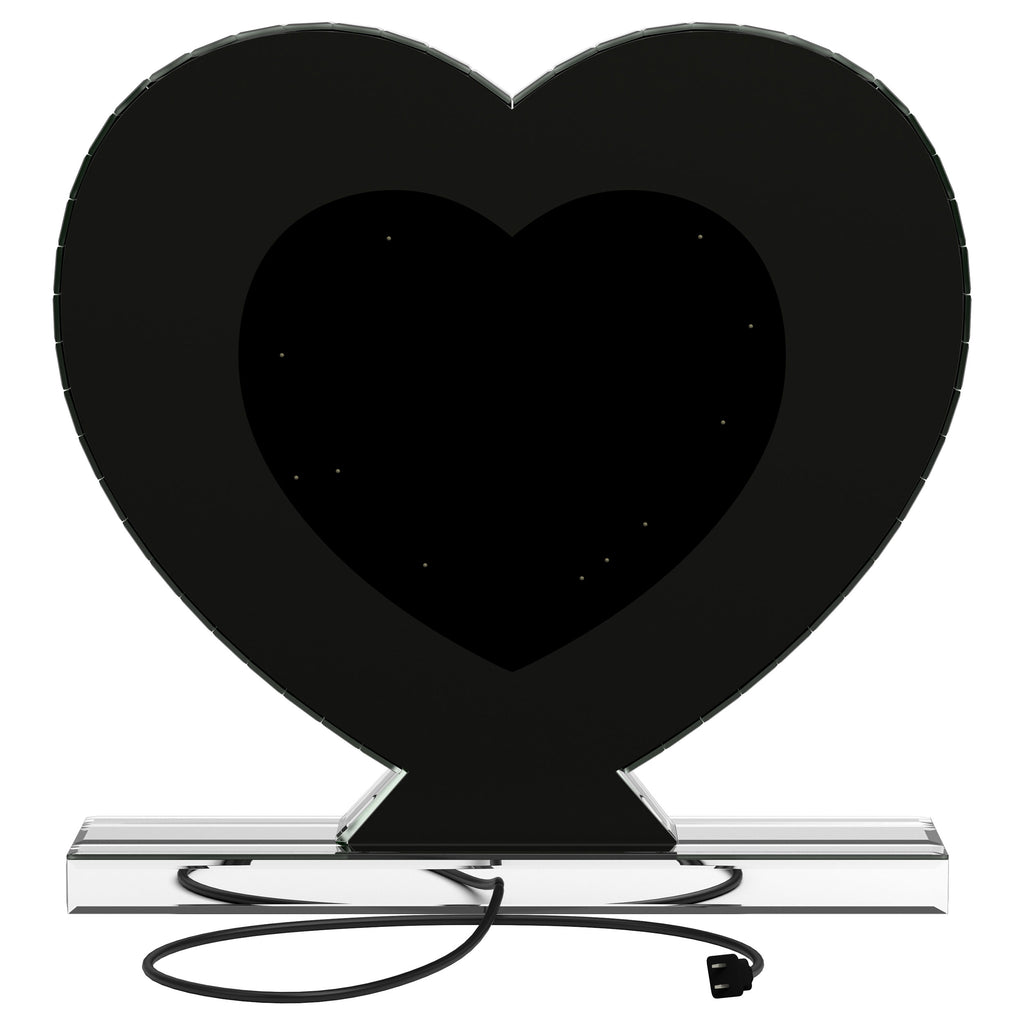 This heart-shaped table mirror blends glam style with practical lighting, perfect for vanities or dressing areas. The mirrored frame features an inset of faceted acrylic crystal inlay that catches light beautifully, while integrated LED illumination adds clarity for grooming or makeup application. Its freestanding design and decorative shape make it as functional as it is eye-catching, ideal for bedroom surfaces or beauty stations. Key Features: • Tabletop vanity mirror with a heart-shaped silhouette for decorative charm and function • Mirrored frame adds sleek shine and elevates the glam-inspired design • Inset acrylic crystal inlay creates a shimmering, textured border • Built-in LED lighting provides enhanced visibility for makeup and grooming • Freestanding base allows stable placement on dressers or vanity tops • Ideal for bedrooms, beauty stations, or glam-themed personal spaces