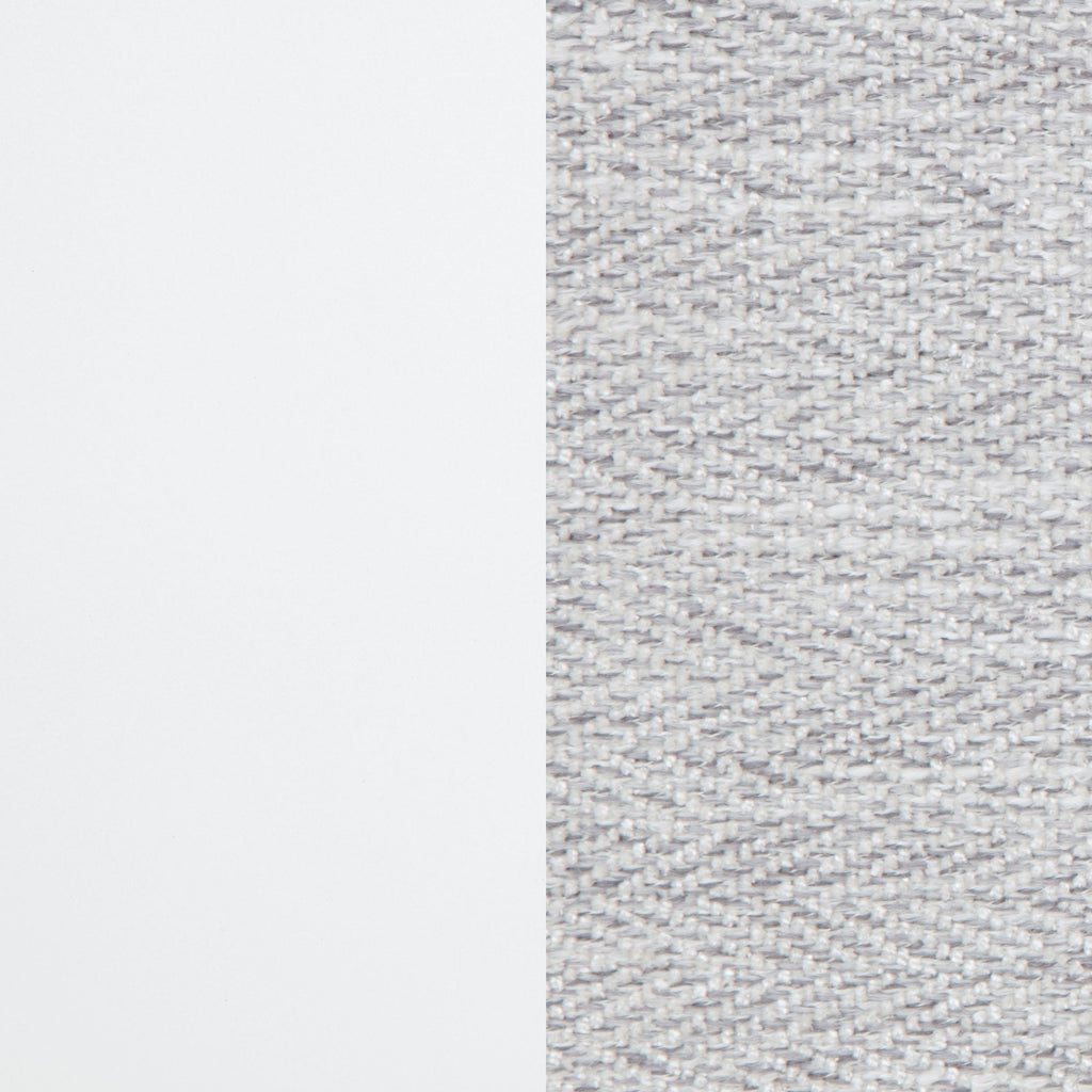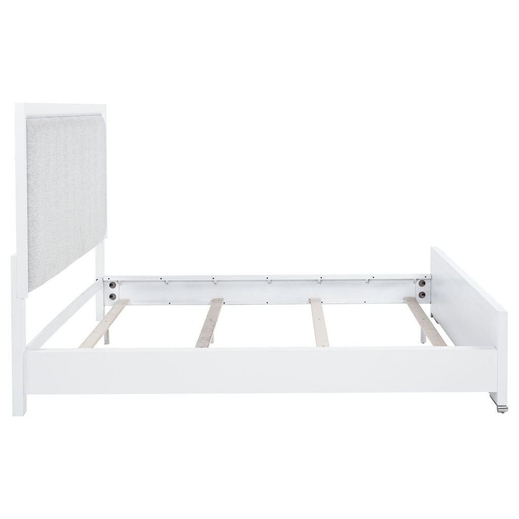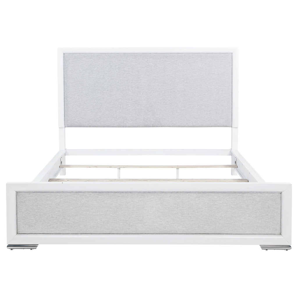 This panel bed pairs crisp framing with soft textures for a look that feels both refined and restful. The panel-style headboard and footboard are upholstered in light grey fabric with subtle herringbone texture, bordered by a clean white frame and finished with brushed nickel feet. Crafted from solid rubberwood, engineered wood, and foam padding, it offers visual contrast and supportive comfort. Foundation required. Key Features: • Queen bed with paneled silhouette and framed upholstery for soft modern contrast • White finish outlines light grey fabric headboard and footboard for clean structure • Upholstered in textured light grey fabric with soft padded foam backing • Brushed nickel feet provide shine and elevate the crisp modern frame • Crafted from solid rubberwood, engineered wood, fabric, and foam • Foundation is required for optimal mattress support and elevation
