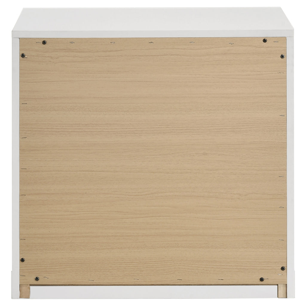Bold in its simplicity, this two-drawer nightstand captures modern Italian influence with practical functionality. The white high gloss finish is made with eco-friendly PET thermoplastic, offering a surface that resists scratches, moisture, and heat. Vertically mounted polished gold pulls create a sculptural focal point, while two drawers provide easy-access storage beside the bed. Arrives fully assembled for instant style and utility. Key Features: • Two-drawer nightstand with bold vertical symmetry and clean modern proportions • Eco-friendly PET thermoplastic finish is scratch-resistant and easy to maintain • PET surface resists moisture and heat, ideal for long-lasting bedside durability • Polished gold pulls are vertically mounted for elegant sculptural contrast • Smooth-gliding drawers provide convenient storage for nighttime essentials • Fully assembled and crafted with engineered wood for strength and stability