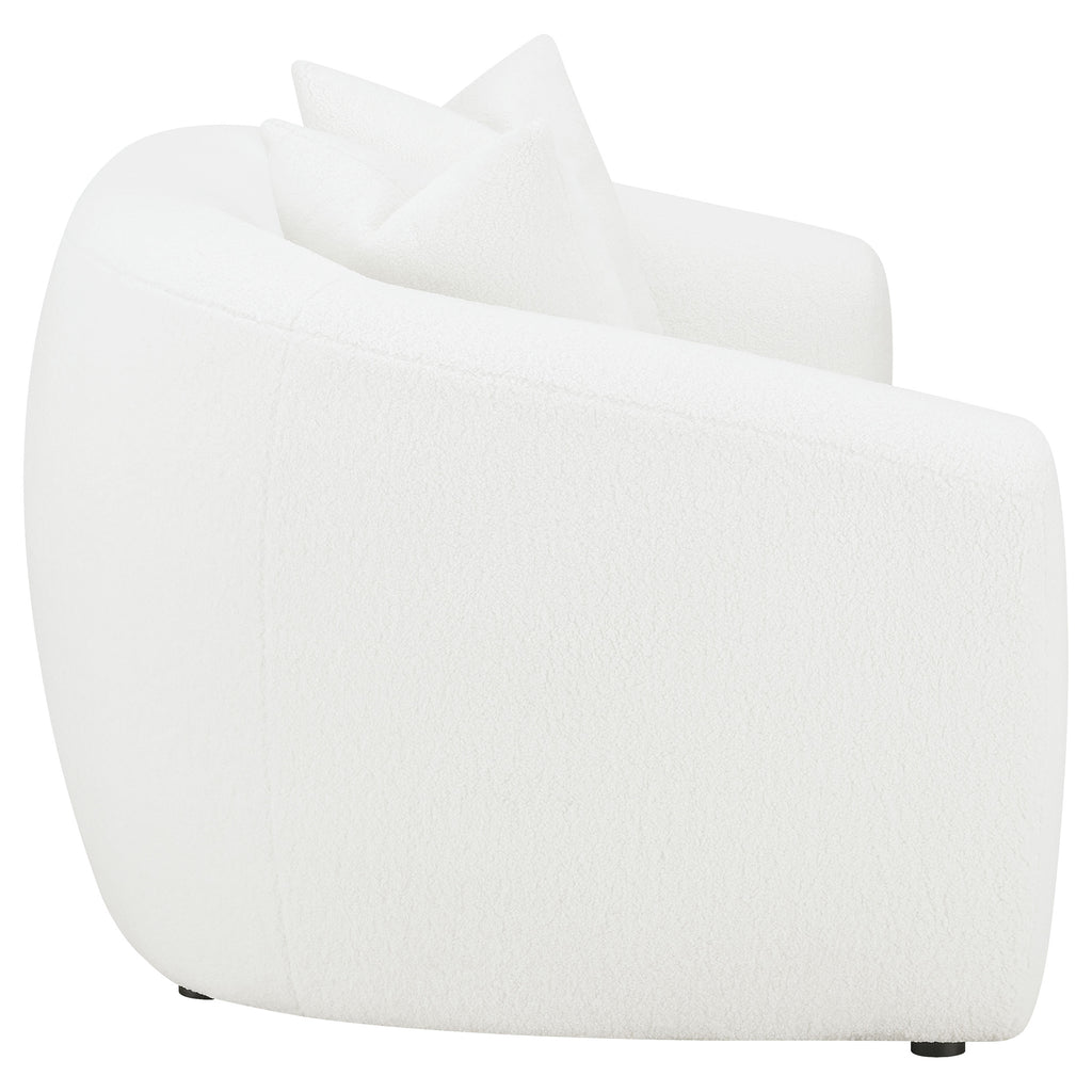 Transform your sophisticated modern living room with this vintage-like contemporary natural loveseat, featuring boucle upholstery that presents an inviting cloud-inspired resting place. Gracefully curved armrests, a single bench cushion, and a tailored backrest complete this retro-inspired look, accented by black legs.