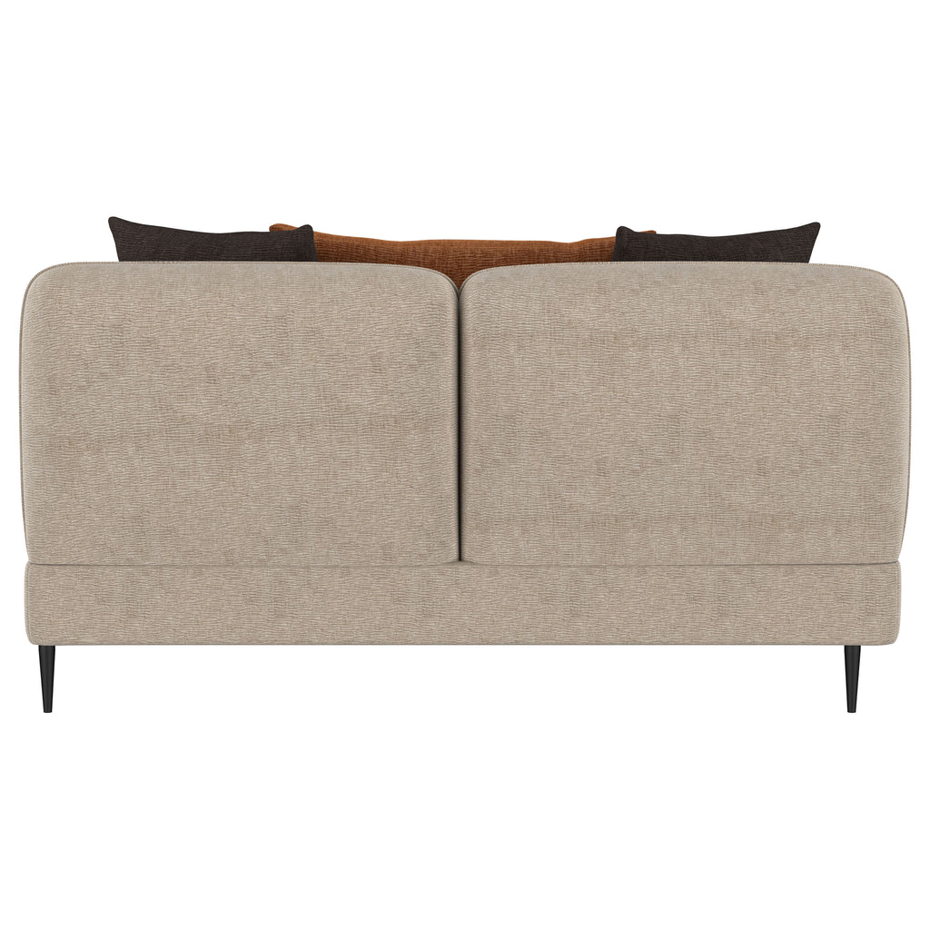 The loveseat blends chic architectural elements with cozy sophistication, wrapped in latte chenille upholstery for a soft, textured feel. Its rounded, sculpted track arms and matching back provide a harmonious design, accented by a sleek waterfall bench seat. Rust and chocolate reversible pillows add inviting contrast, while slender tapered metal legs enhance its contemporary flair. A sinuous spring seat deck, full foam cushions, and fiber-filled back ensure optimal comfort and durability for everyday lounging. Key Features: • Latte chenille upholstery delivers a textured and cozy surface • Sculpted track arms and back for a symmetrical, modern silhouette • Waterfall bench seat with full foam cushioning for plush comfort • Includes two reversible rust and chocolate accent pillows • Sinuous spring seat deck and tapered metal legs for stability and style • Foam and fiber-filled back for added support and lasting shape