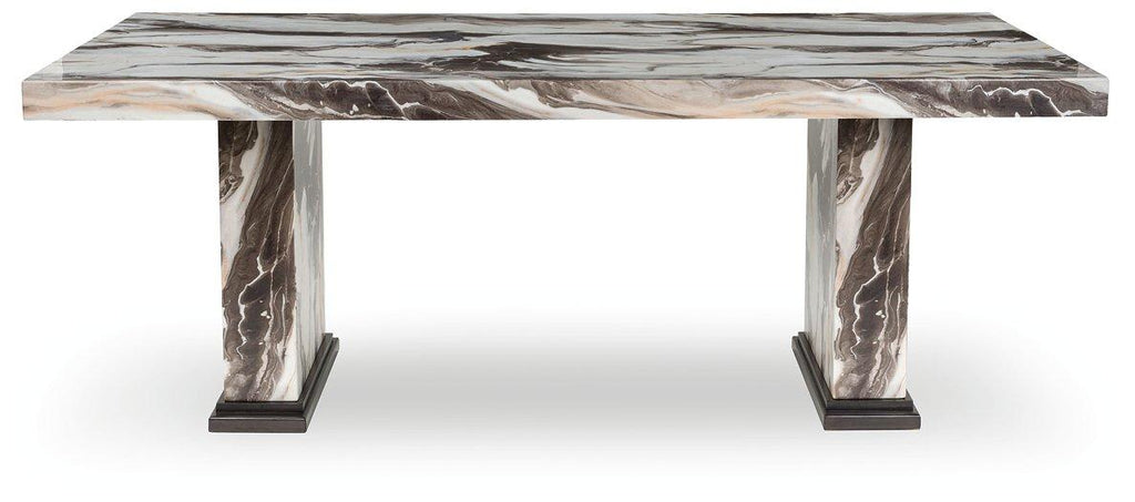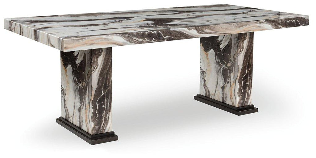 • Tabletop and double pedestal base with replicated marble pattern; polyester topcoat for lasting beauty