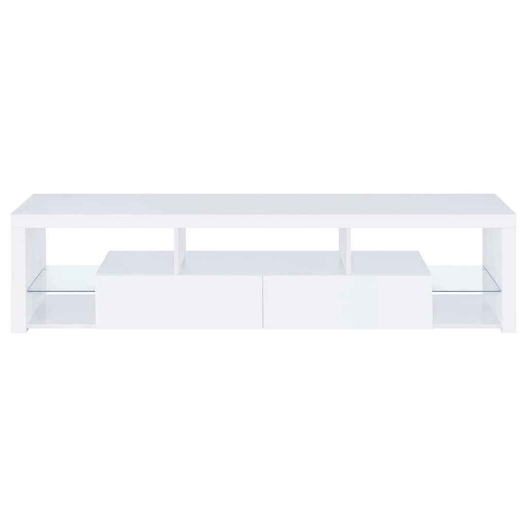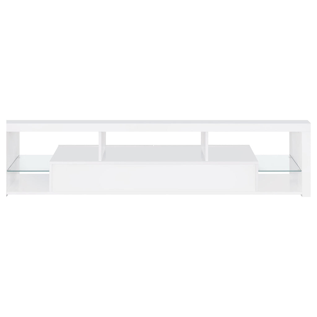 Elevate your entertainment arena with our sleek, modern TV stand. Drenched in a pristine glossy white-on-white finish, it radiates sophistication, accentuated by clear glass details. Its soft-close drawers ensure smooth operation, while glass shelves present a chic display option. Generous storage compartments cater to all your media needs. To enhance the ensemble, the set comes with matching media towers, amplifying storage capacity and offering a unified, stylish appearance. This combo not only meets functional demands but also serves as a captivating focal point in any contemporary space. Key Features: • Sleek, modern design with pristine glossy white-on-white finish and clear glass details • Soft-close drawers for smooth operation and glass shelves for chic display • Generous storage compartments to meet all media needs • Matching media towers to amplify storage capacity and create unified, stylish appearance • Captivating focal point for any contemporary space