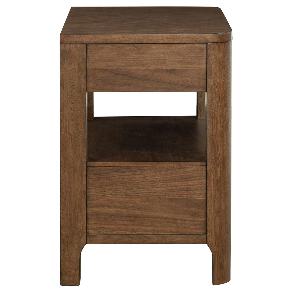 Create a space for reading materials and a table lamp at your bedside with this transitional wooden nightstand. It features two storage drawers with cedar and includes felt lining in the top drawer for added protection. Its open silhouette features a shelf between its two drawers, lending airy flair to your bedroom ensemble. The beside table offers easy storage, while delivering a refined profile complete with rounded corners and legs. Drawer fronts include fingertip pulls with a graceful curve, creating visual depth in any bedroom. Key Features: • Enhance your bedside with the handsome profile and lovely character of a transitional nightstand • Nightstand features rounded corners and two drawers, with a shelf in between, perfect for books • Walnut wood veneer lends warmth and creates a touch of texture with natural grain patterns • Top drawer is complete with dark brown felt lining, offering easy protection for delicate items • Drawers feature cedar lining that helps to protect against pests and provides excellent quality