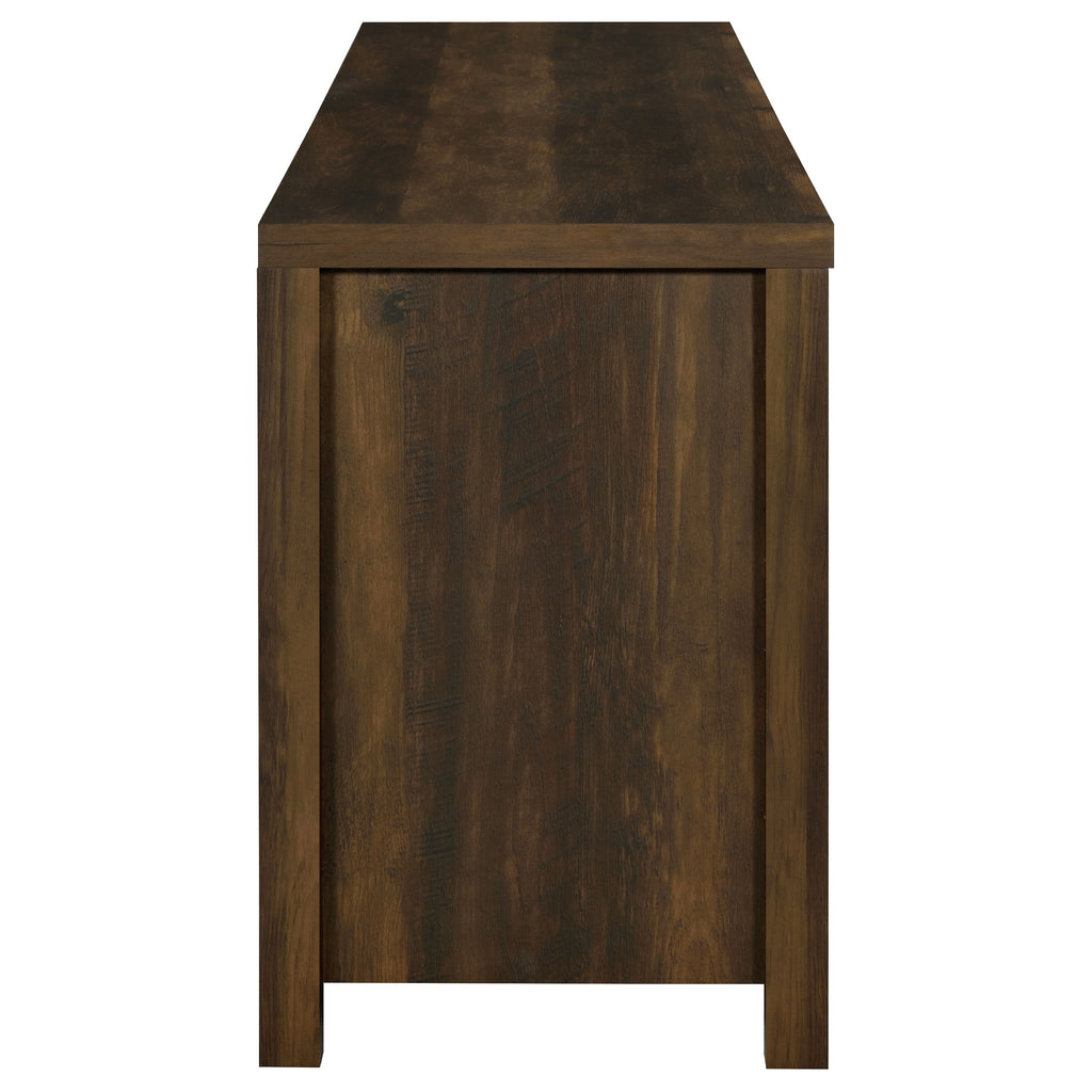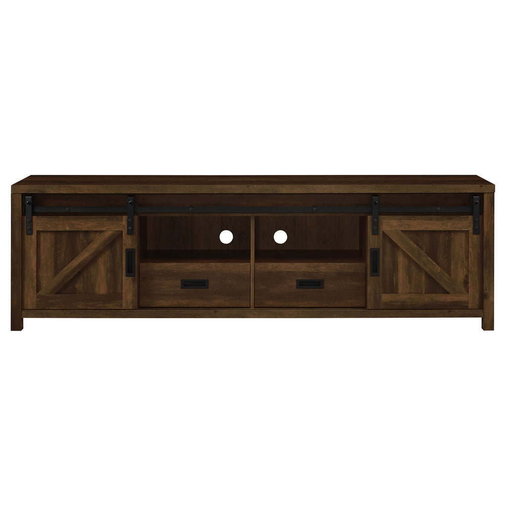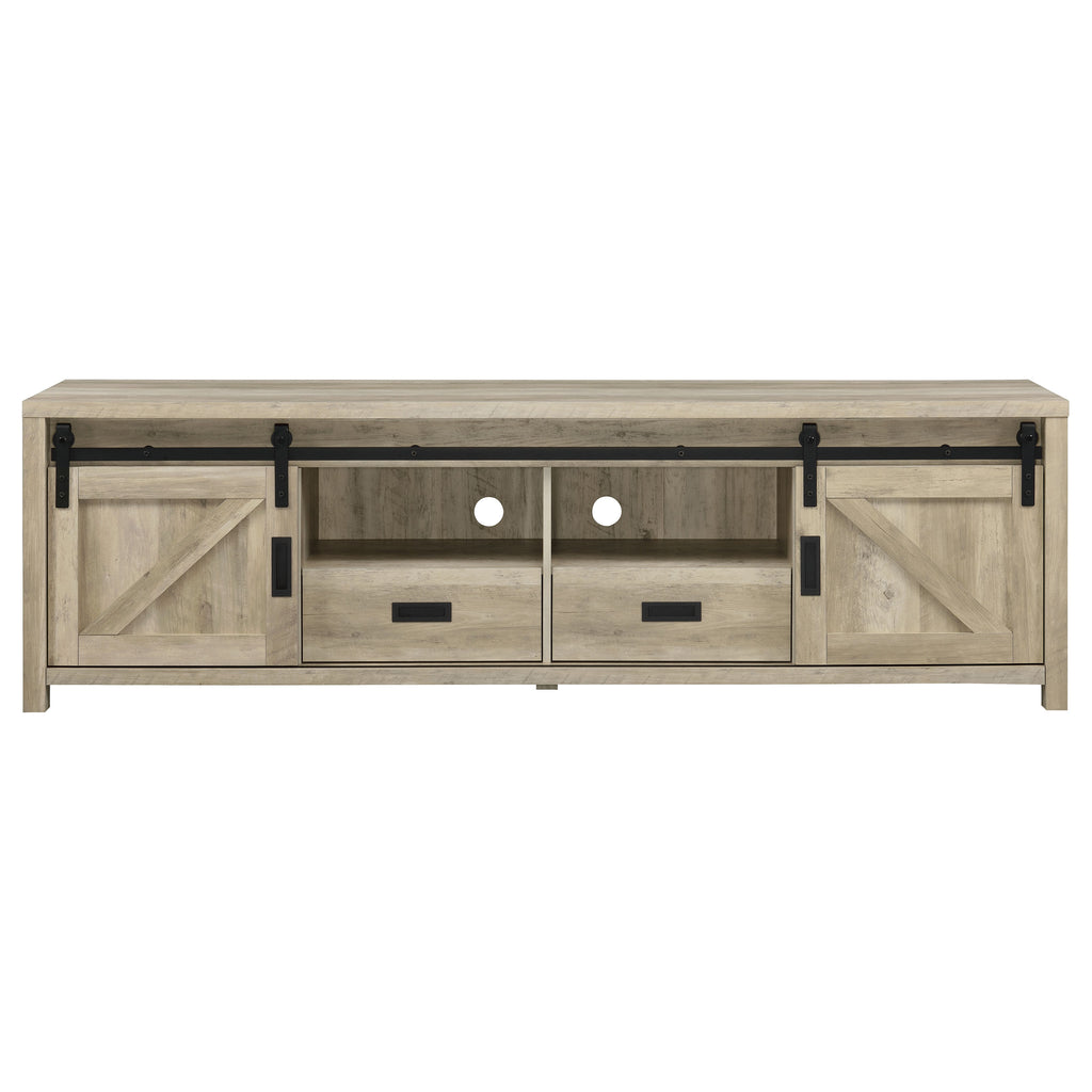 Wood-like finishes and country-inspired elements create this rustic style TV console. Keep entertainment consoles, a stereo and more tucked neatly within two open shelves toward the center. Disguised by sliding barn doors mounted on black hardware that lend an industrial touch, this television console also stores away entire collections of movies, games and music. With its long rectangular design and clean square edges, this console furniture piece makes an excellent addition to entertainment rooms and living rooms. This TV console makes a charming, versatile piece for your entire entertainment system setup. Key Features: • Seventy-nine inch TV stand with rustic distressed pine wood appearance • Sliding barn doors reveal hidden compartments for organized storage • Black metal hardware adds industrial contrast to farmhouse styling • Two center shelves provide open display space for electronics or décor • Constructed from engineered wood, metal, and durable veneer surfaces • Perfect centerpiece for rustic, transitional, or modern living spaces