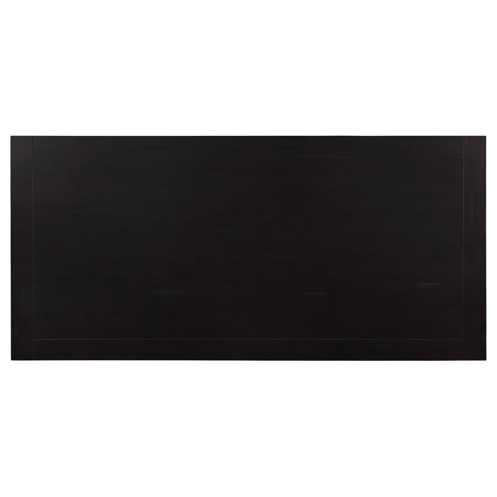 This stunning 5-piece dining room set is sure to be showpiece of the home. The rectangular wood dining table is marvelously crafted with clean, crisp lines. Its two sturdy legs feature a mix of curved lines and sharp angles for a strong, imposing manner. The four side chairs feature plush cushioning and rolled seatbacks with button-tufted craftsmanship. Chairs are upholstered in brilliant white fabric with contrasting nailhead trim and leg finish. Key Features: • This relaxed traditional style is made for everyday dining as well as special gatherings • Table fits 8 chairs comfortably • Family sized dining table has a fixed top and stout pedestal columns • Rustic espresso wood finish is contrasted by cream color, tufted, parson side with nailhead trim