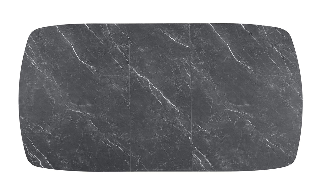 This modern dining table blends sleek aesthetics with functional versatility. The black marble-printed melamine tabletop offers a luxurious look while being scratch- and water-resistant for everyday durability. Its expandable design includes a 15.75-inch self-storing leaf, allowing the table to extend from 57 inches to 72.75 inches to accommodate additional guests. A bold, trapezoid-shaped base with a black hammer-tone powder-coated finish provides sturdy support, making this table a stylish centerpiece for contemporary dining spaces. Key Features: • Modern dining table with a luxurious black marble-printed melamine tabletop • Scratch and water-resistant surface ensures durability and easy maintenance • Expands from 57" to 72.75" with a 15.75" self-storing leaf for added seating capacity • Trapezoid-shaped black hammer-tone powder-coated metal base for sturdy support • MDF construction enhances strength and stability for long-term use • A perfect blend of contemporary style and practical functionality for dining spaces