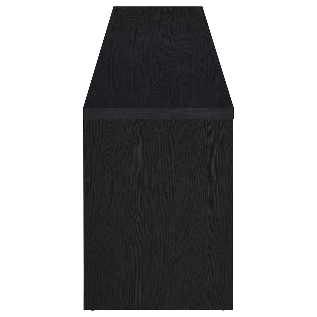 Upgrade your entertainment space with this black TV stand, crafted from engineered wood with a paper laminate veneer for durability and a sleek finish. The clean lines and modern design include open shelves for electronics, a wire management hole to reduce clutter, and three concealed drawers for organized storage. Perfect for flat-screen TVs, this media console combines style and functionality for any contemporary setup. Key Features: • 59-inch black TV stand with sleek, modern design • Engineered wood with durable paper laminate veneer finish • Open shelves with wire management hole for devices • Three spacious drawers provide ample concealed storage • Sturdy construction ensures long-lasting use • Perfect for flat-screen TVs and entertainment centers