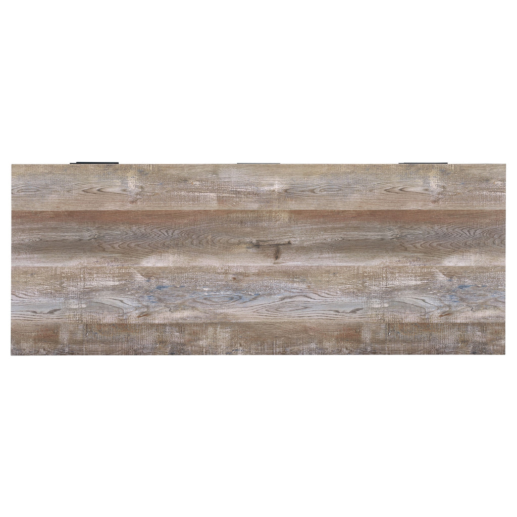 Infuse your office space with stylish simplicity. With a rustic, aged oak finish, this office desk exudes classic charm. Its strong silhouette is brought to life by crisp, clean lines of bold, black metal. Complete with five spacious storage and file drawers, this desk makes it easy to stay organized. Complete with euro glides and high-quality craftsmanship, it's the ultimate in durable practicality. Key Features: • Industrial-inspired office desk with weathered oak top and black metal frame • Includes four drawers and one cabinet for storage and organization • Engineered wood top offers spacious work surface with laminate coating • Flat black drawer pulls complement minimalist modern styling • Ideal for home offices needing concealed file and supply space • Durable, functional design supports both remote work and study setups