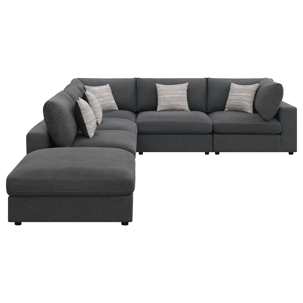 Covered in a linen-like fabric all around, this super comfy six-piece sectional offers all the seating you need in an open concept living room or entertainment area. Designed with three armless chairs, two corner chairs and a single oversized ottoman, this contemporary modular sectional offers reversible pillows and jacquard accent pillows that you can really sink into. Black feet peer from beneath, offering a slight elevation for rugs and other flooring. With an L-shape design, this sectional works in a variety of room dimensions. A spacious ottoman also doubles as a coffee table, keeping a tray of refreshments and snacks when hosting guests.