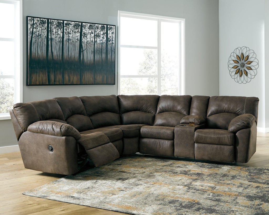 With plush cushions and wraparound pillow top arms, this sectional takes comfort to a whole new level. Faux vintage leather requires minimal care, making this relaxation station ideal in homes with children and pets. Reclining feature engages with the pull of a tab, putting pleasure at your fingertips.