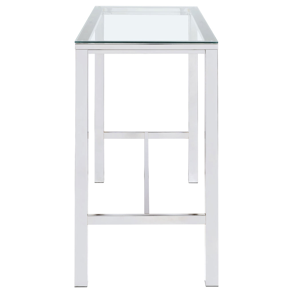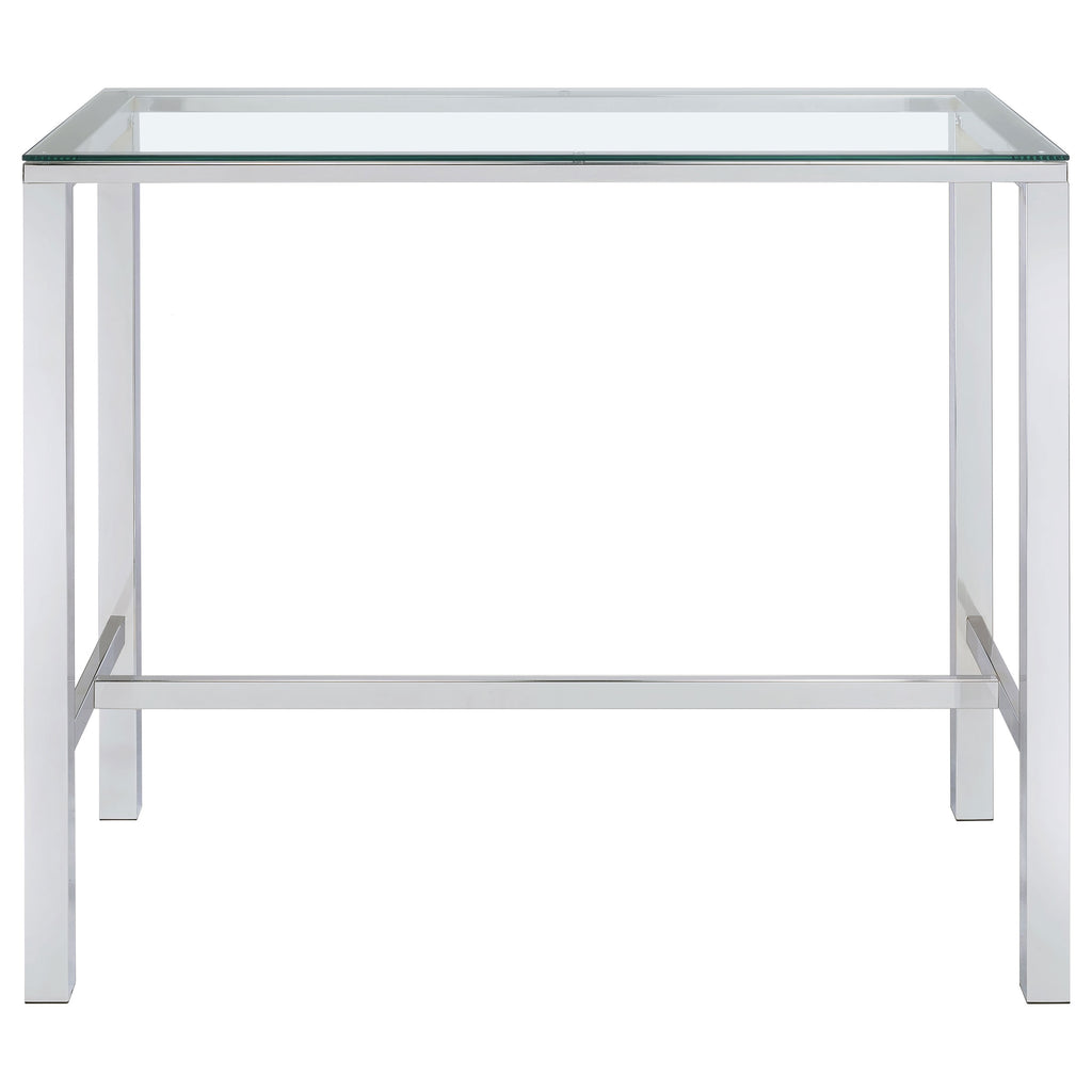 Add a flash of panache to your rec room or home bar with this modern bar table. Contemporarily designed with chrome legs and glass top. Crisp, clean lines cut an incisive silhouette. A martini with an olive or a classic old fashioned both deserve a bar table like this. Calculate your next investment or discuss your impending joint venture in style. Key Features: • Rectangular pub-height bar table with a bold, modern and minimalist aesthetic • Clear tempered glass top offers long-lasting durability and an airy, open feel • Sturdy metal frame in a polished chrome finish enhances sleek contemporary style • Sleek, angular legs provide enhanced stability and a streamlined silhouette • Versatile design complements dining areas, home bars, or loft-inspired interiors • Ideal for casual gatherings or creating a sophisticated and stylish bar space
