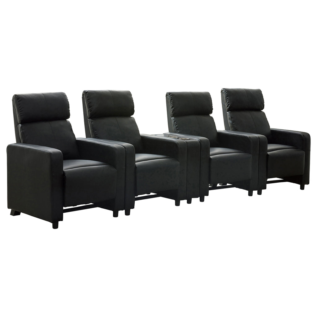 Transform your living room into a cinematic retreat with this modern home theater seating collection. Upholstered in smooth black leatherette, each push back recliner offers plush headrests, supportive armrests, and pocket coil seating with a cool gel memory foam topper for lasting comfort. Removable stainless steel cupholders built into the wedge consoles provide convenience and easy maintenance. Sleek stitching details and a tailored silhouette add contemporary refinement, while sturdy construction ensures durability for years of entertainment._x005F_x000D_ Key Features: • Three push back recliners in black leatherette with modern home theater design • Plush headrests and padded armrests enhance relaxation during long viewings • Pocket coil seating with gel memory foam topper provides superior comfort • Two wedge consoles connect recliners seamlessly into a theater-style layout • Removable stainless steel cupholders offer convenience and easy maintenance • Crafted with foam, hemlock, metal, and plastic for lasting strength and support
