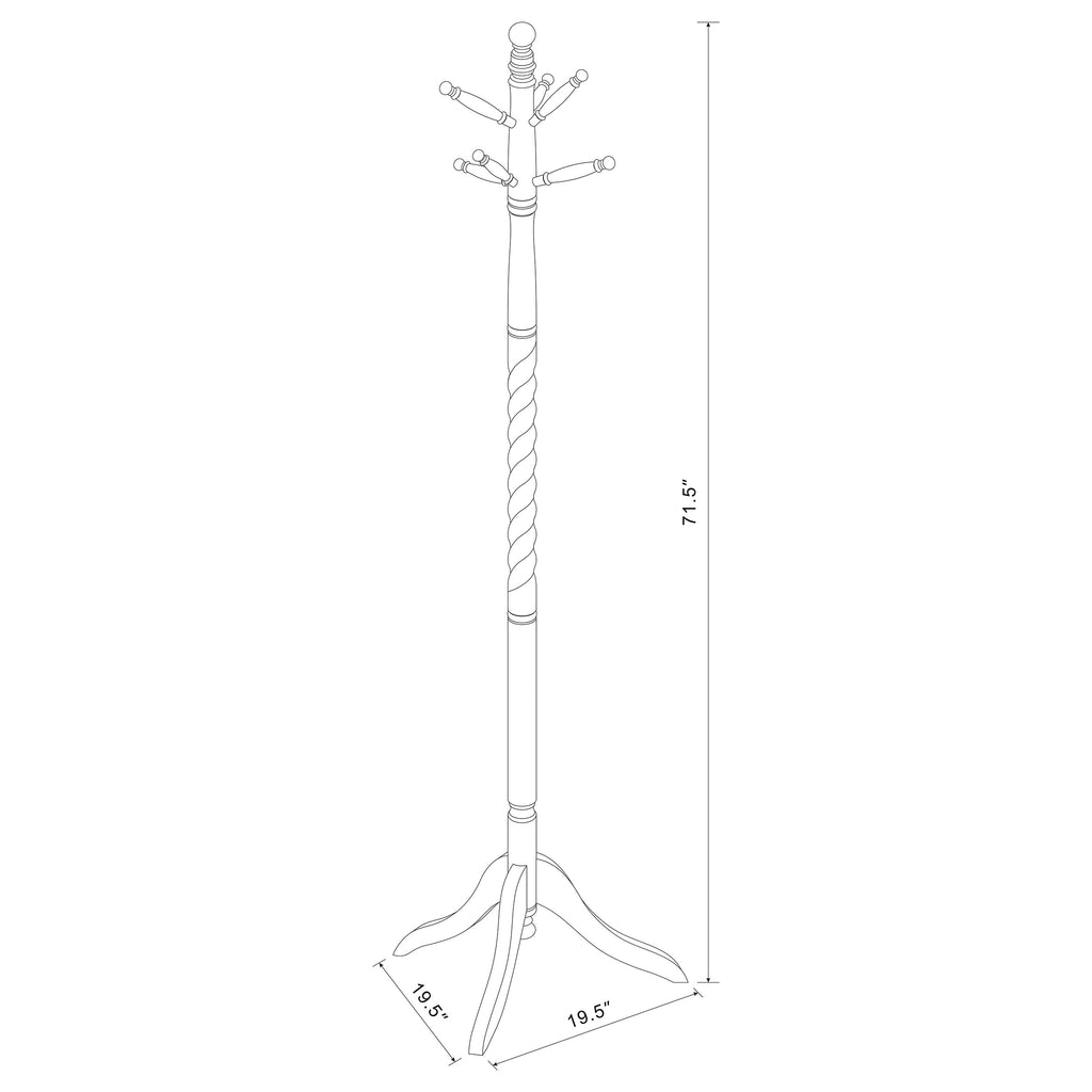 Crafted from solid rubberwood, this traditional coat rack showcases elegant detailing and lasting durability. The merlot finish enhances its rich tone, while a twisted post adds visual interest and classic appeal. Designed with two tiers of rounded pegs, it provides ample hanging space for coats, hats, and scarves. A three-leg base offers stability, making it ideal for entryways, offices, or living spaces. Key Features: • Coat rack crafted from solid rubberwood for lasting strength and stability • Merlot finish adds warmth and richness to classic or traditional interiors • Twisted center post offers a decorative touch with vintage-inspired charm • Two tiers of rounded pegs provide space for coats, hats, scarves, and accessories • Tripod base ensures balanced support and reliable freestanding use • Perfect for foyers, bedrooms, or office corners needing vertical storage