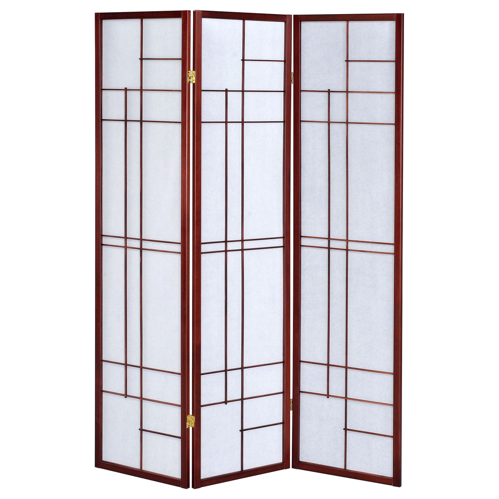 Enhance your space with this Japanese-inspired three-panel shoji screen, designed with slim linear details that create a striking geometric look. The warm cherry-finished wood frame offers a rich contrast against the crisp white paper panels, blending traditional style with contemporary appeal. Flexible hinges allow the panels to fold and adjust, making it perfect for dividing a room, adding privacy, or serving as an accent piece. Crafted from FSC-certified rubberwood with durable fabric, this screen balances function and artistry._x005F_x000D_ Key Features: • Three-panel room divider with Japanese-inspired slim linear geometric design • Cherry-finished wood frame provides warmth and elegant contemporary appeal • White paper fabric panels create contrast and soften natural or artificial light • Durable construction from FSC-certified rubberwood ensures lasting quality • Hinged panels fold easily to adjust layout for privacy or decorative function • Functions as both a practical divider and a stylish accent for modern interiors