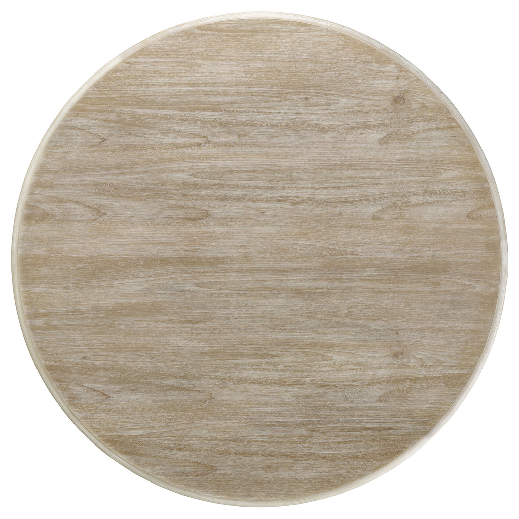 Design your inviting dining space around this modern farmhouse round dining table. Its welcoming ambiance is encouraged with its silhouette, creating a perfect spot for family dinners and easy-going conversation. The table features a decorative base with pedestal style despite its four curvy, flared legs that lean toward a classic look. It features hardwood construction with veneers, all in a white finish with wire brushing that create a distressed, lived-in look and feel. Adda vase of fresh cut flowers or stylish linens and you're all set to go. Key Features: • Charming casual style brings character to a modern farmhouse round dining table • Distinctive flared pedestal-style base adds sculpted, artisan style that captures attention • White finish over wood construction is wire brushed to create a chic distressed look and feel • Stacked disc foot creates chic stability and style in a kitchen or dining room • Round tabletop features a rounded edge for a soft, inviting look perfect for family and friends