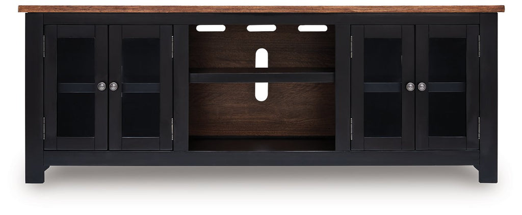 Raise the bar on modern farmhouse style with the Wildenauer TV stand. Its sturdy silhouette and casual good looks are accentuated with a two-tone finish, which pairs a warm satin black base with a contrasting butcher block veneer top. Glass door cabinets with adjustable shelves offer plenty of storage for media and electronics. And removing the center cabinet’s shelf allows room for the optional fireplace insert (sold separately), adding instant warmth and romance. Whether your style is vintage, country or eclectic, this TV stand adds a hearty element.